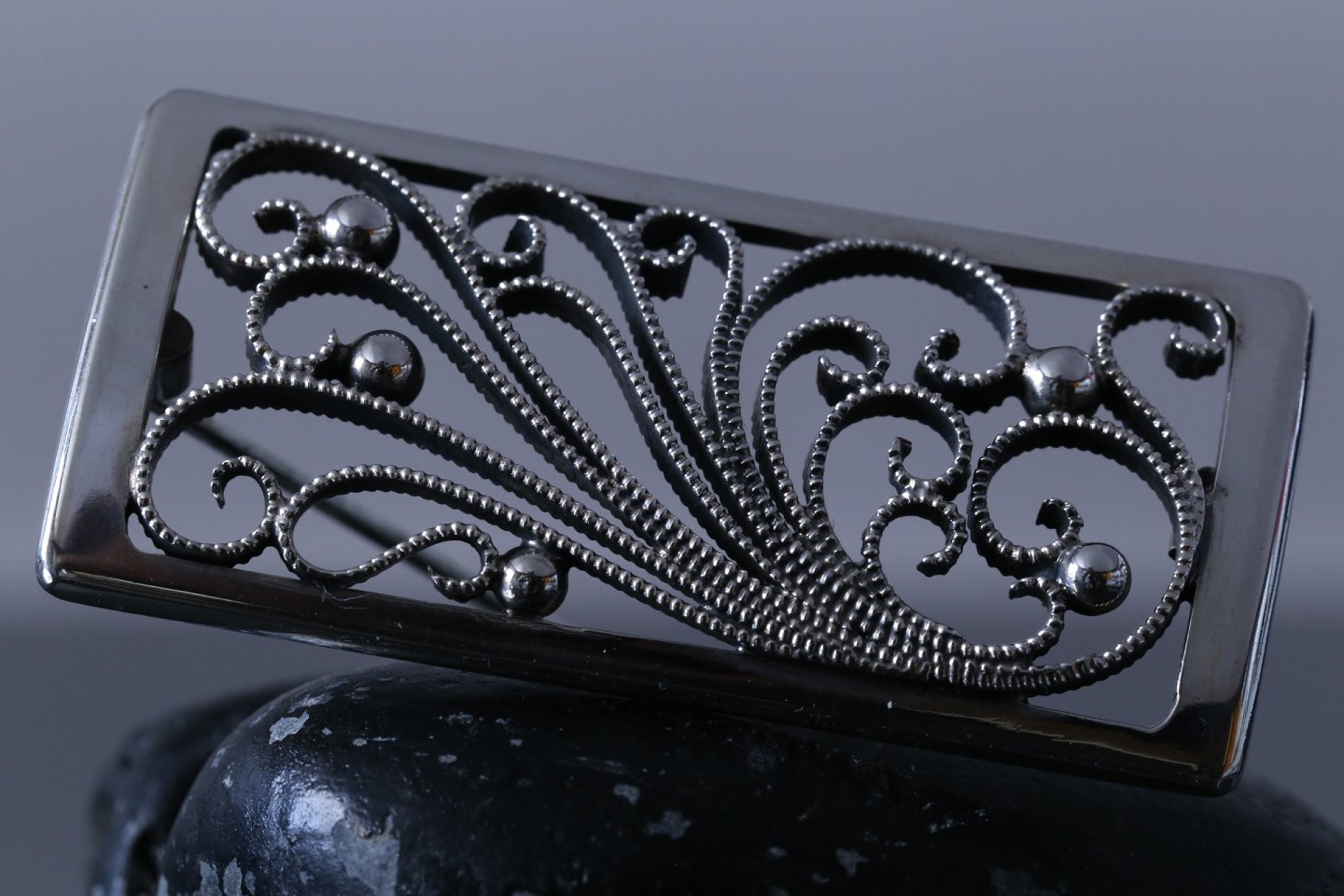 Silver brooch with very nice pattern and many details. An absolutely exclusive piece of jewelry that is sure to attract many compliments. It is clear that the silversmith has gone to great lengths to create an exclusive piece of jewellery, and it has clearly succeeded.