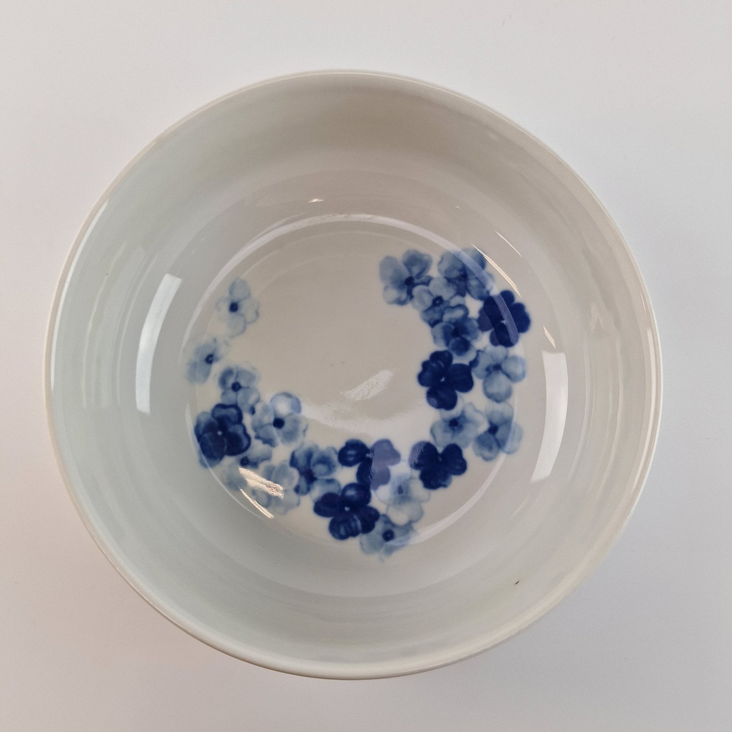 Troja er af kraftigt hvidt porcelæn med mønster af blå blomster