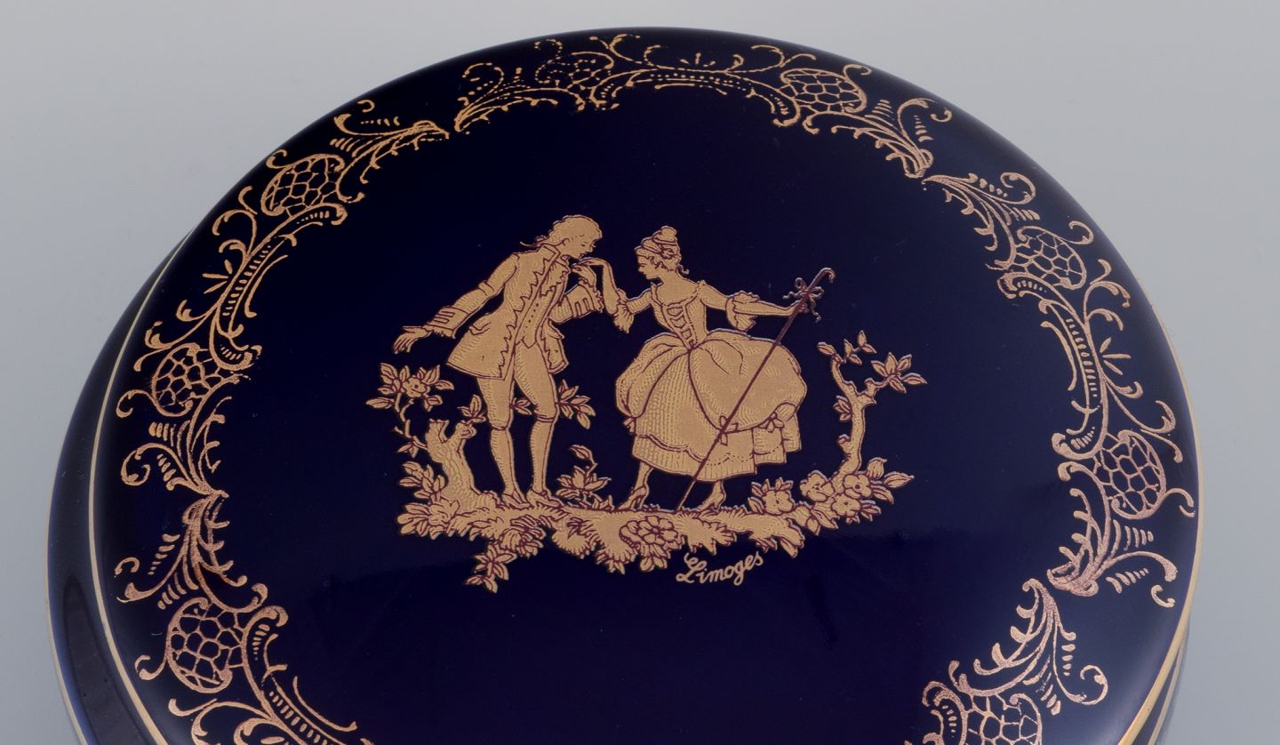 Limoges, Frankrig. To runde lågkrukker i porcelæn. Dekoreret i 22-karat bladguld. Smuk kongeblå glasur. Scène galante.