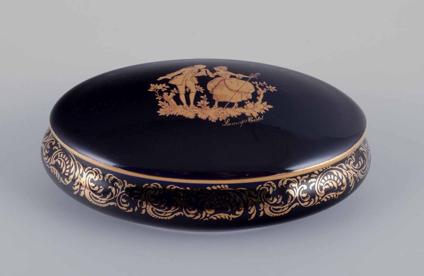 Limoges, Frankrig. To lågkrukker i porcelæn i porcelæn (en oval). Dekoreret i 22-karat bladguld. Smuk kongeblå glasur. Scène galante.