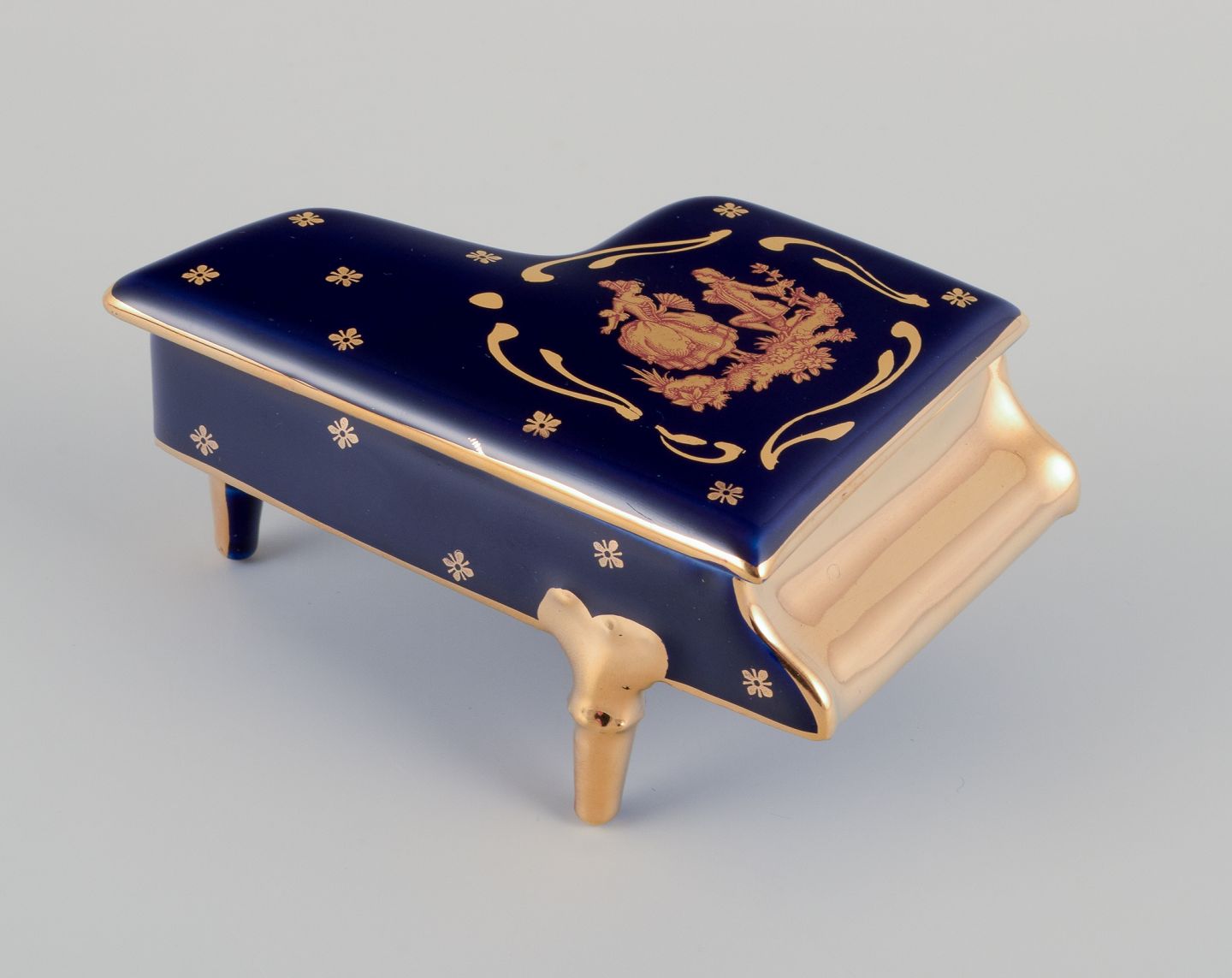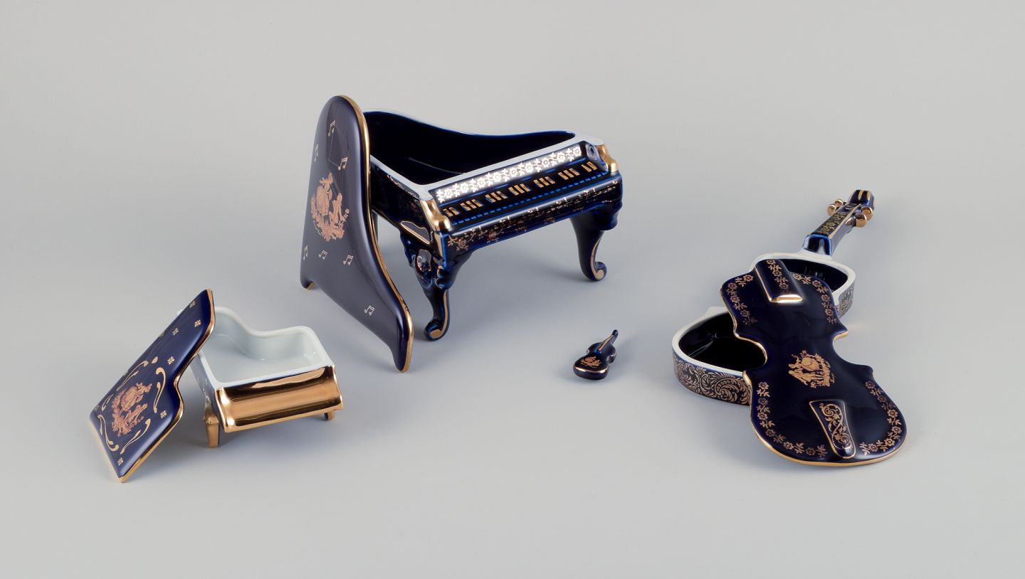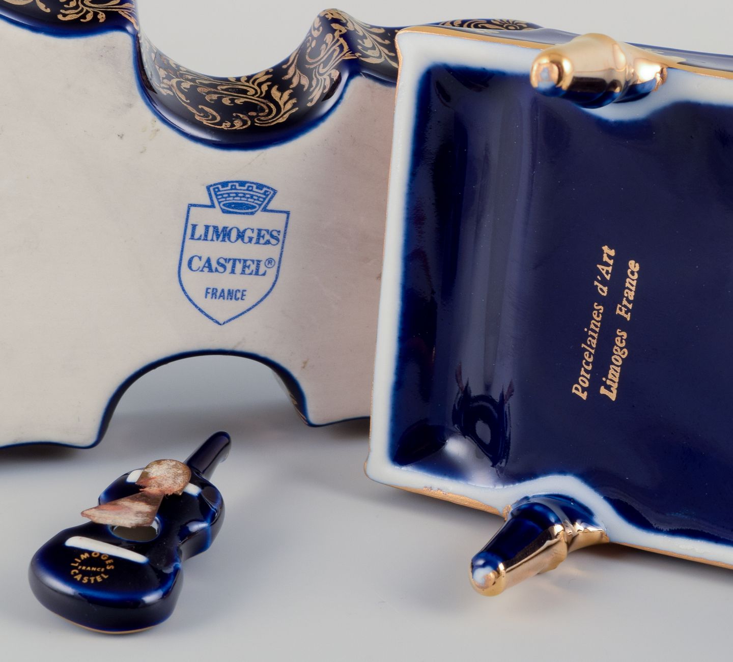 Limoges, Frankrig. Fire instrumenter i porcelæn. Dekoreret i 22-karat bladguld. Smuk kongeblå glasur. Scène galante.