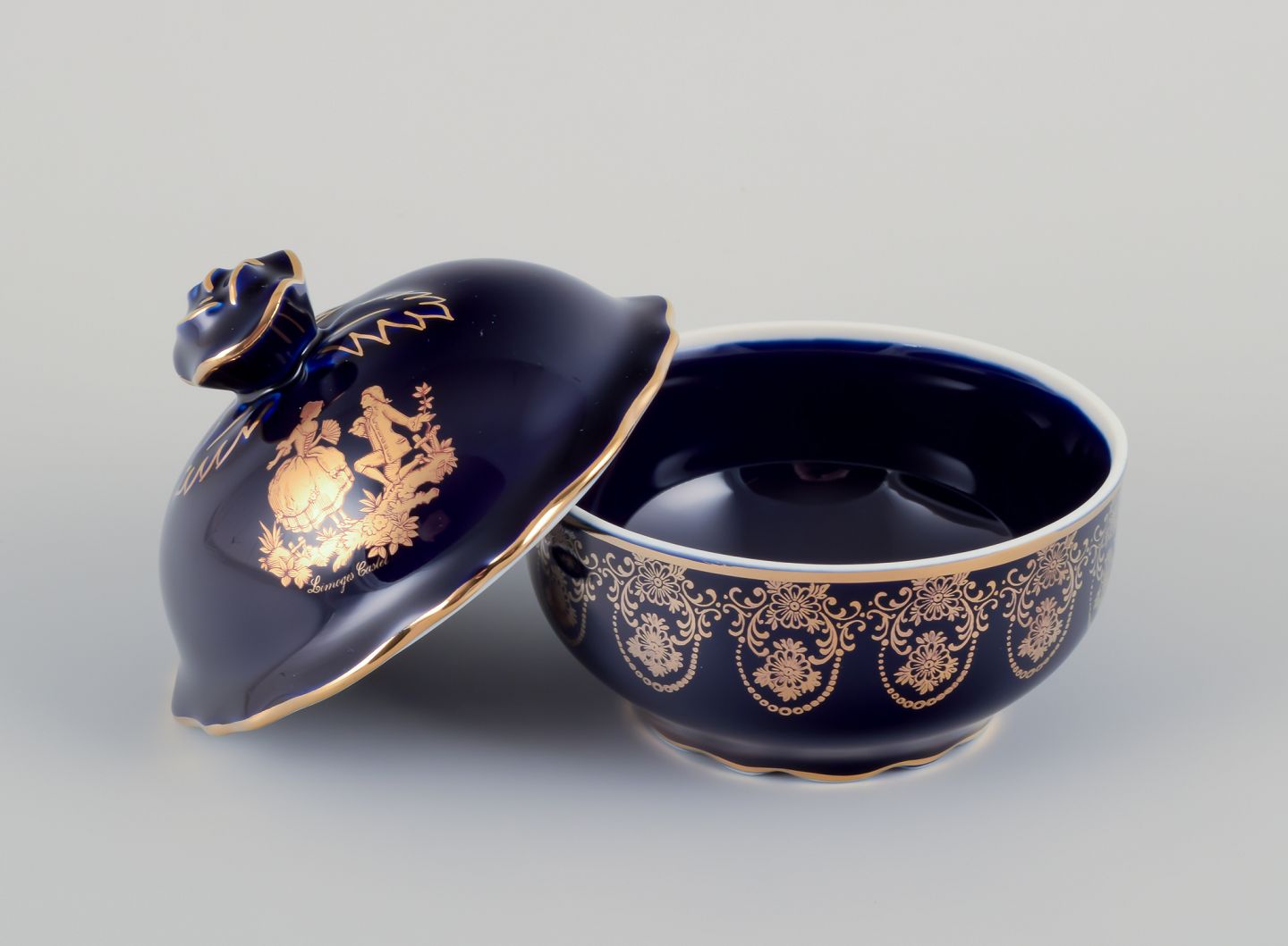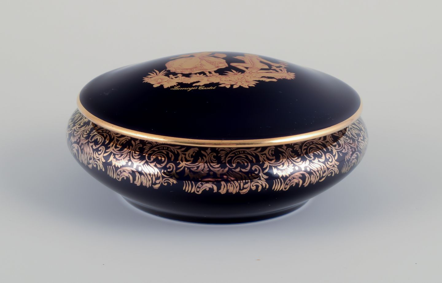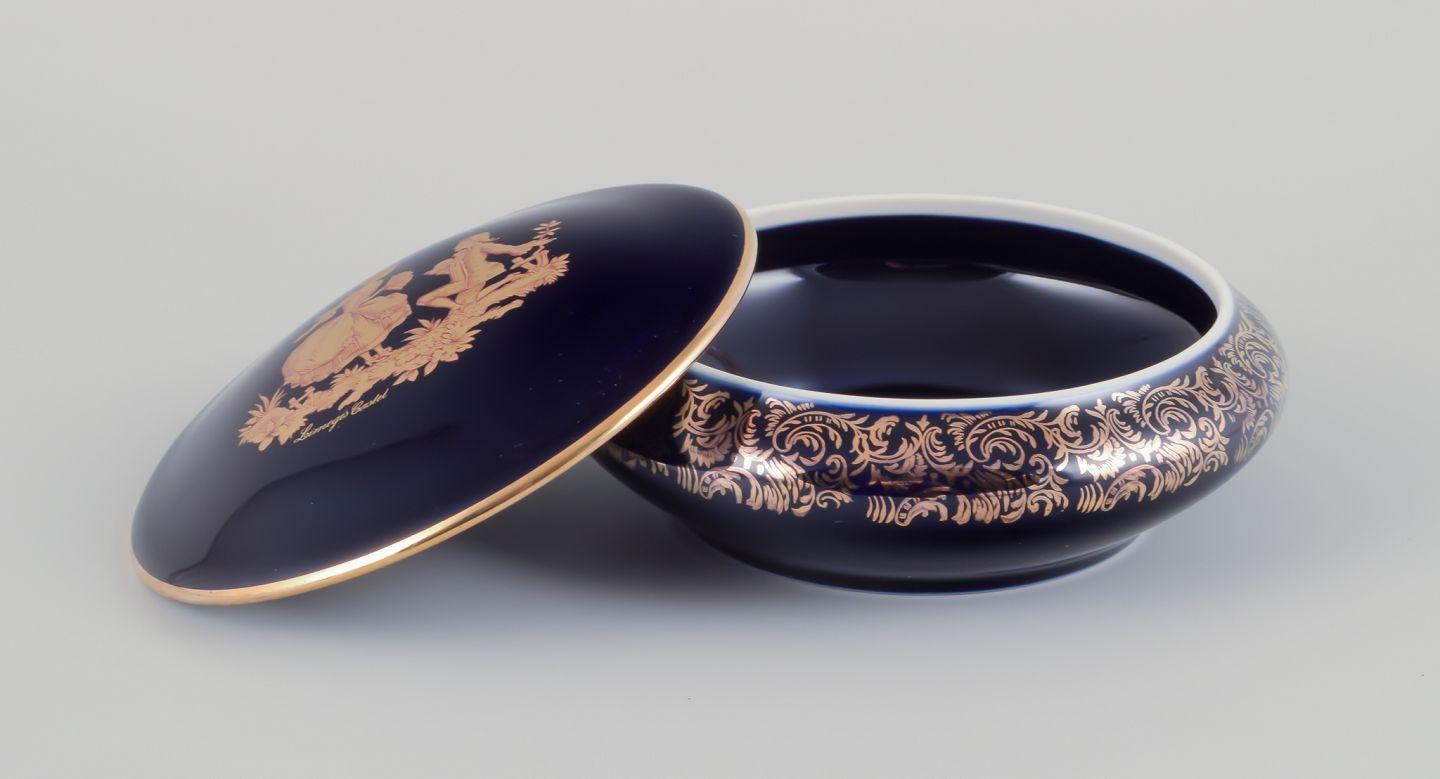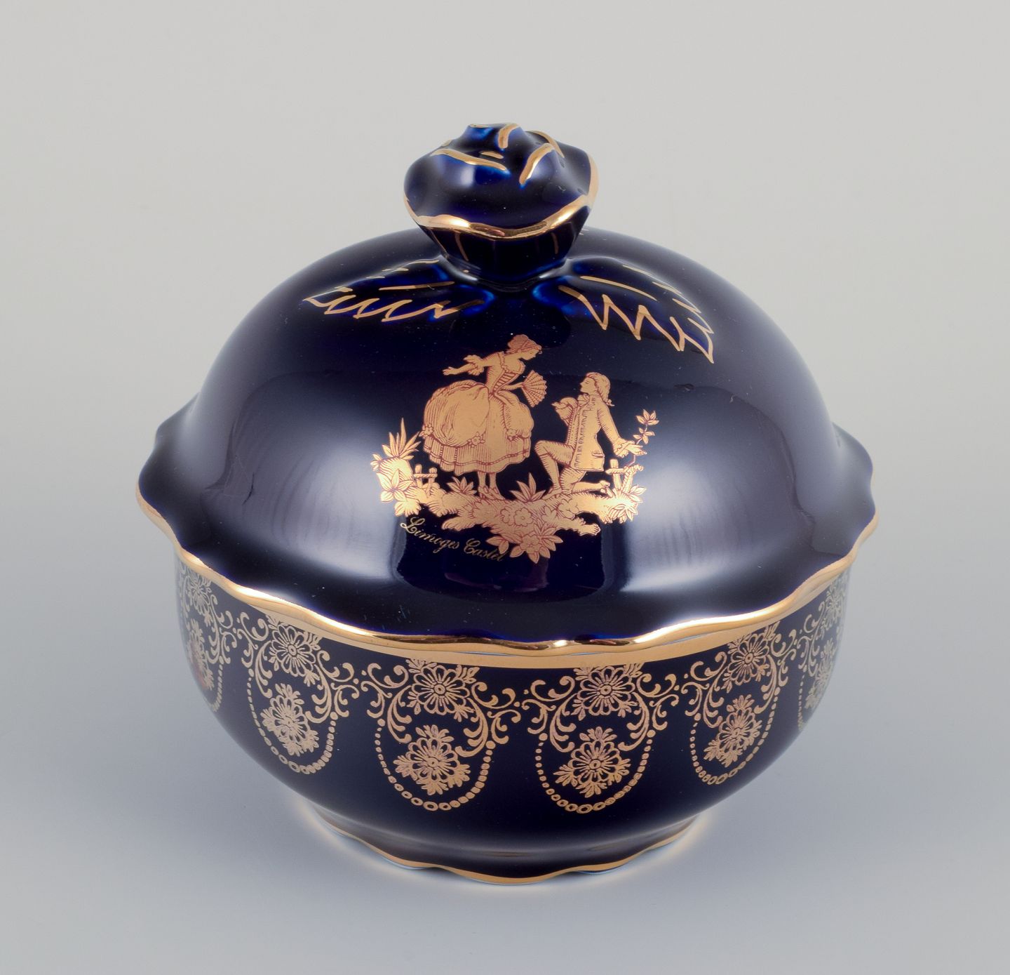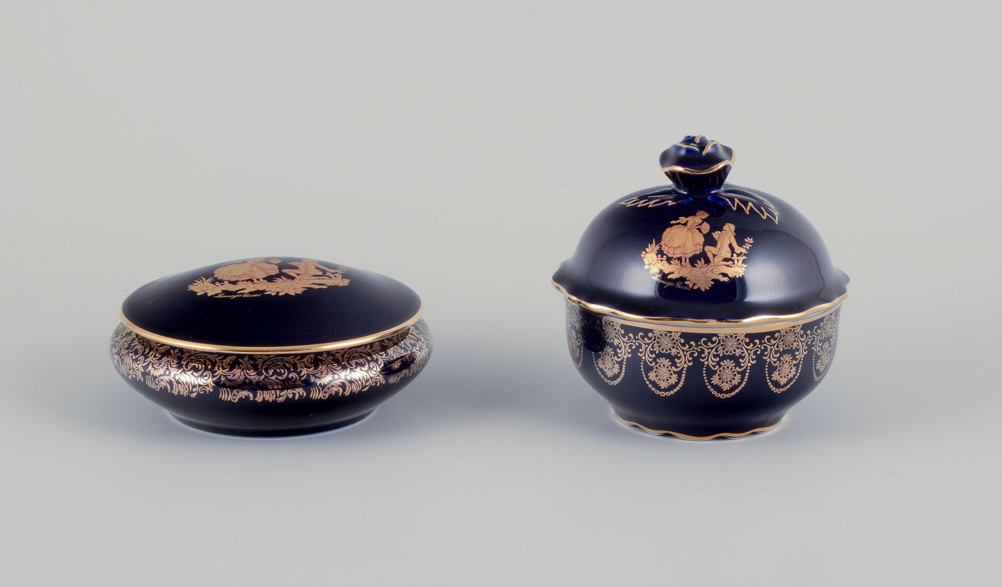 Limoges, Frankrig. To lågkrukker i porcelæn i porcelæn. Dekoreret i 22-karat bladguld. Smuk kongeblå glasur. Scène galante.