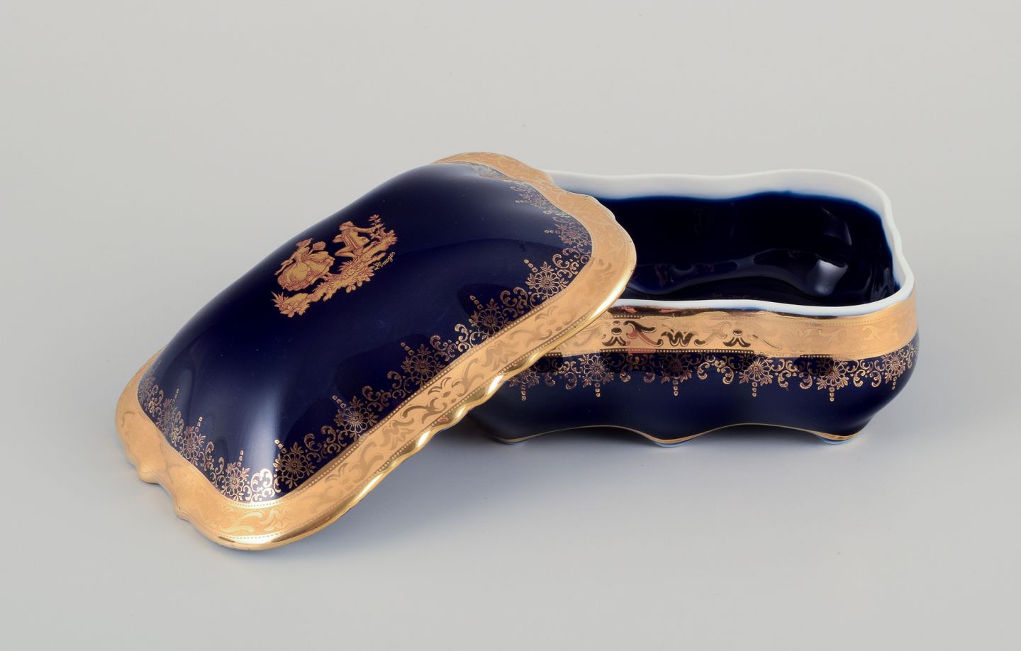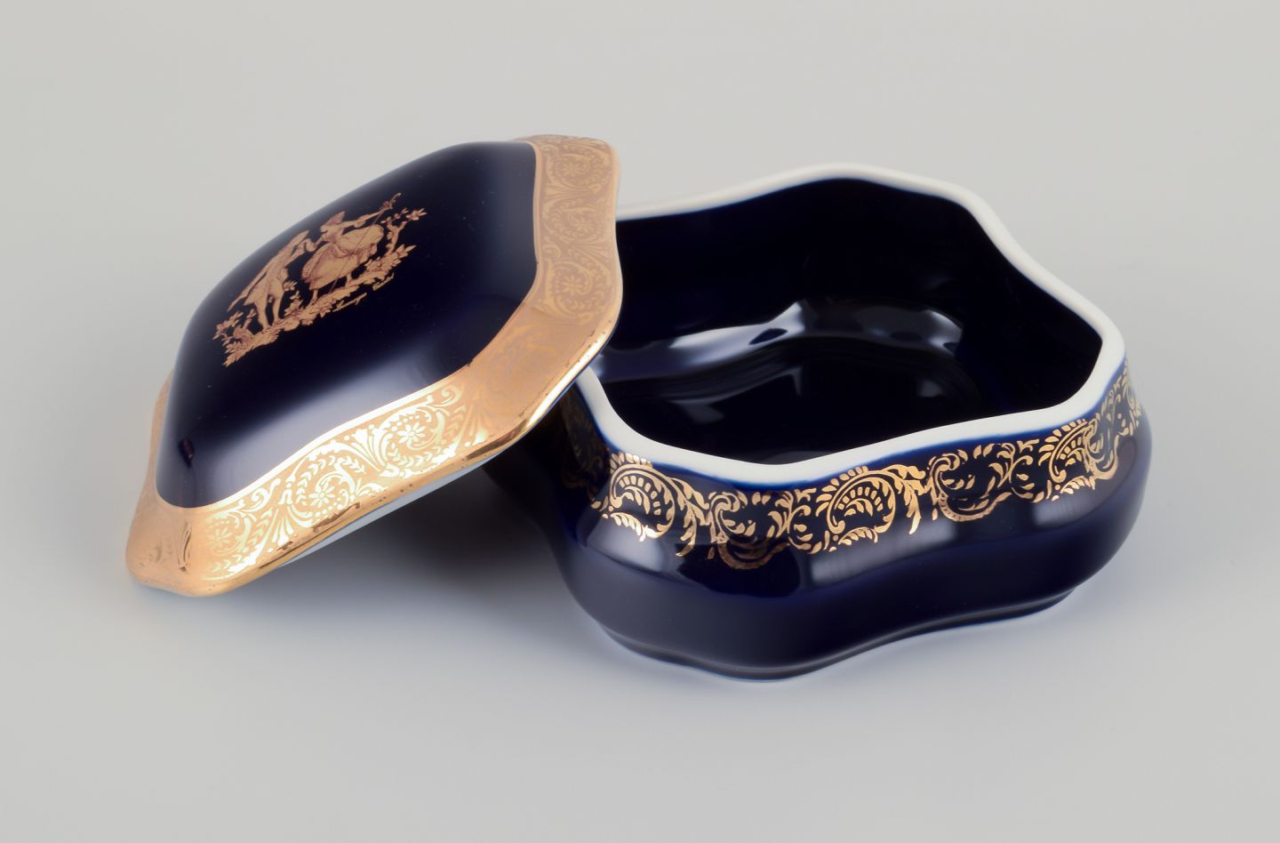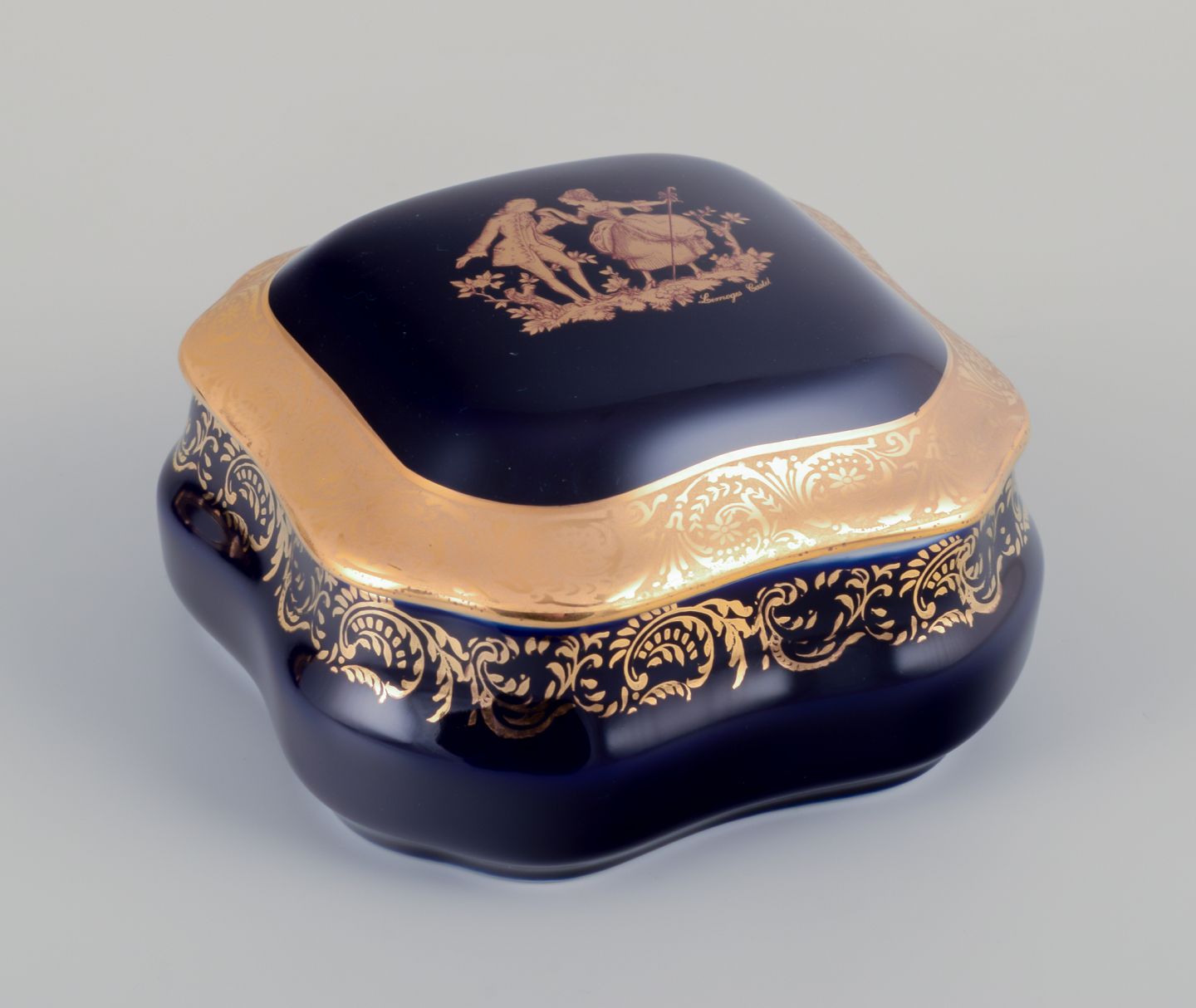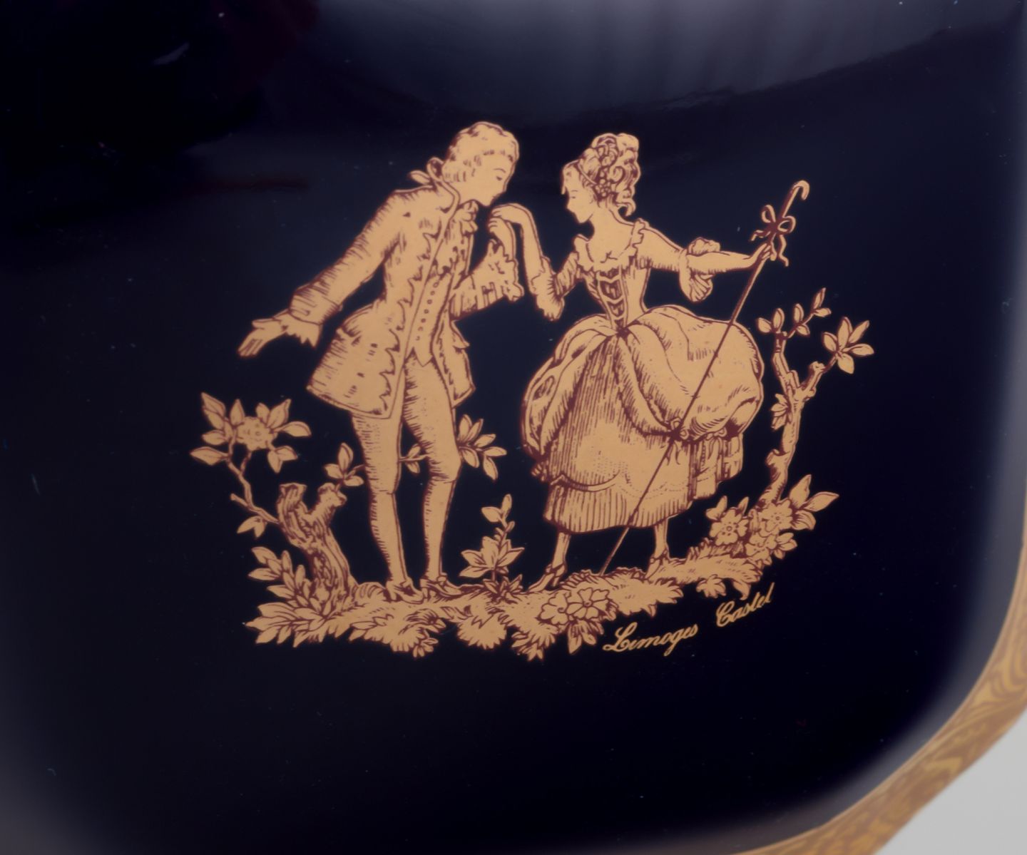 Limoges, Frankrig. To lågkrukker i porcelæn. Dekoreret i 22-karat bladguld. Smuk kongeblå glasur. Scène galante.