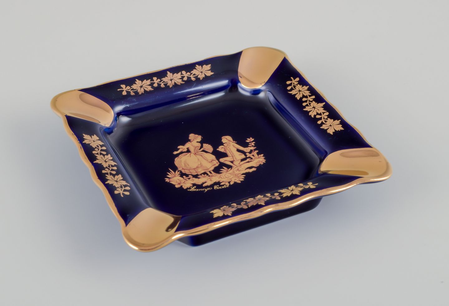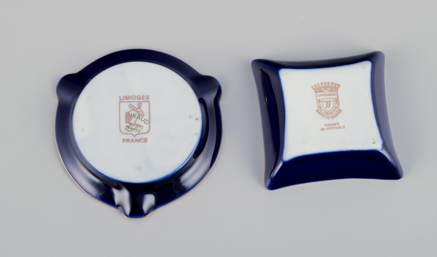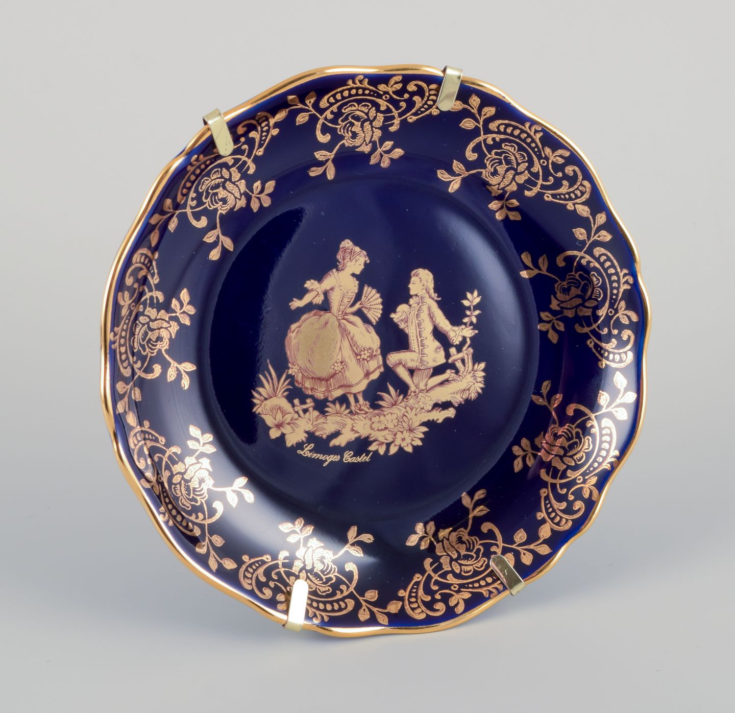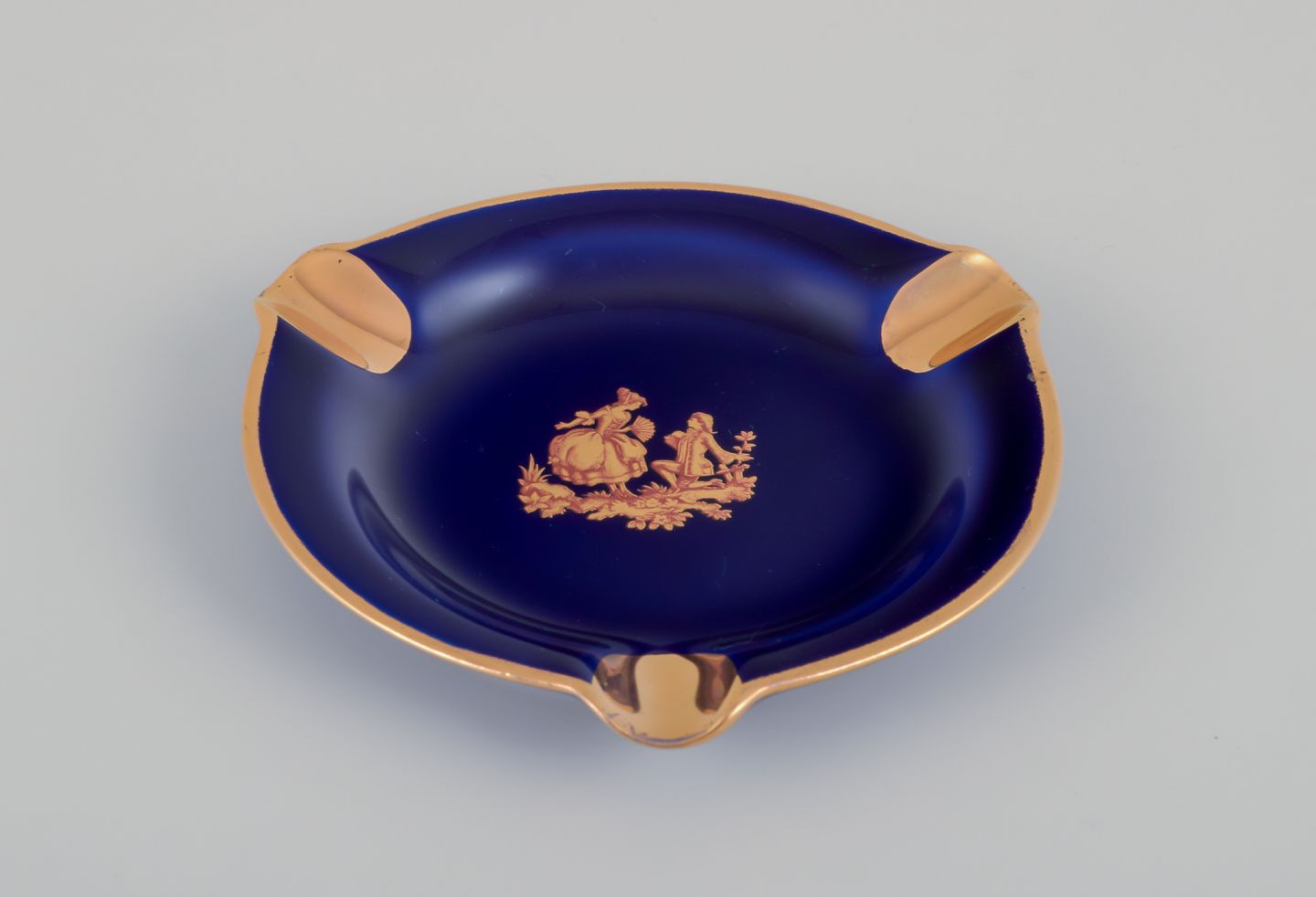Limoges, Frankrig. Fem dele porcelæn bestående af små fade og skåle. Dekoreret i 22-karat bladguld. Smuk kongeblå glasur. Scène galante.