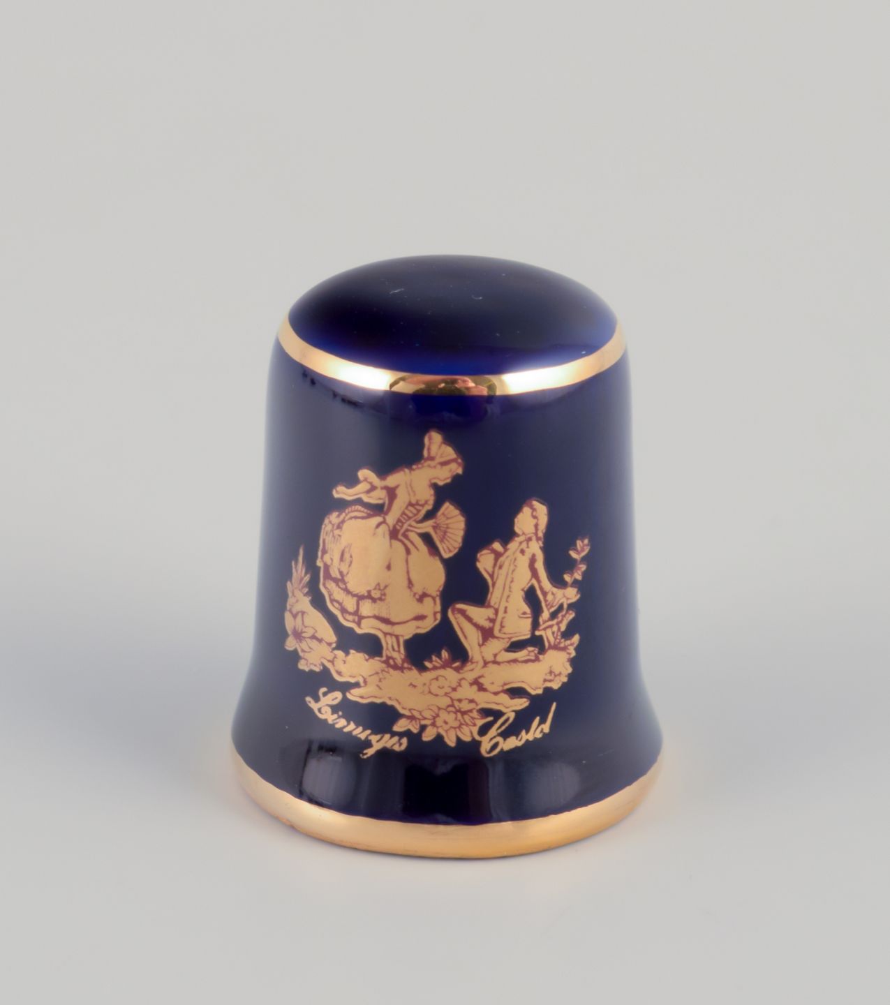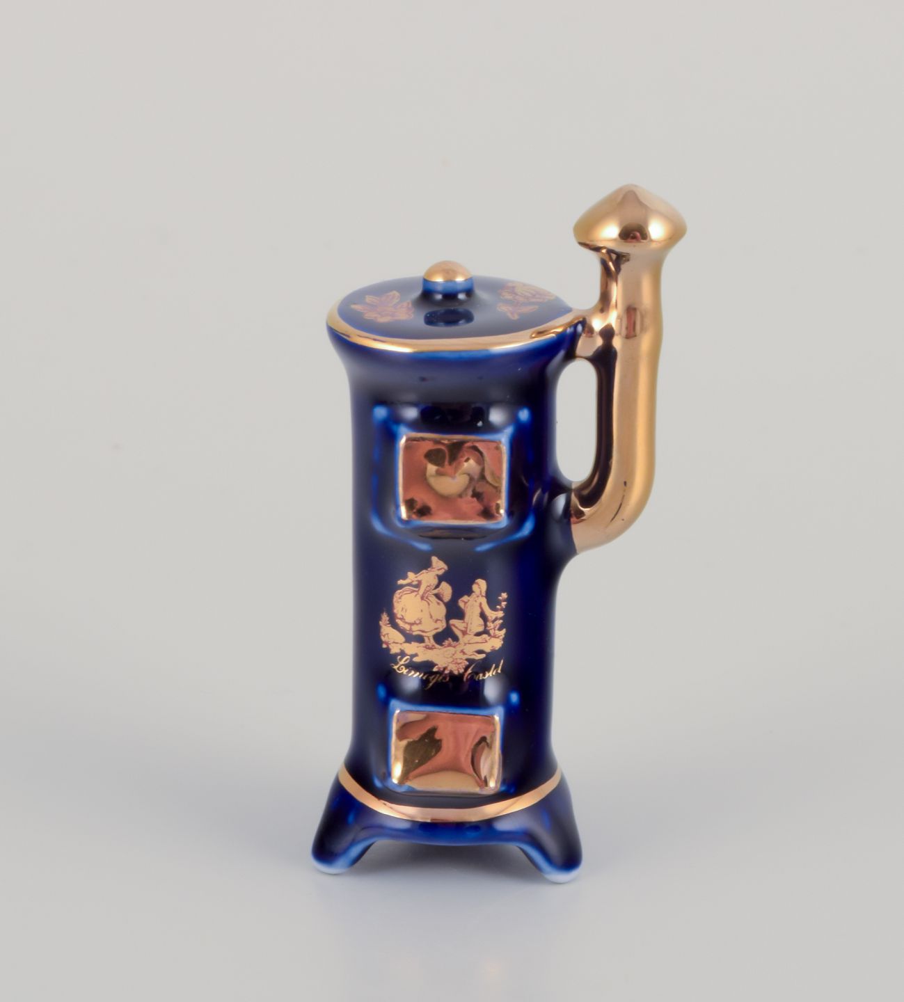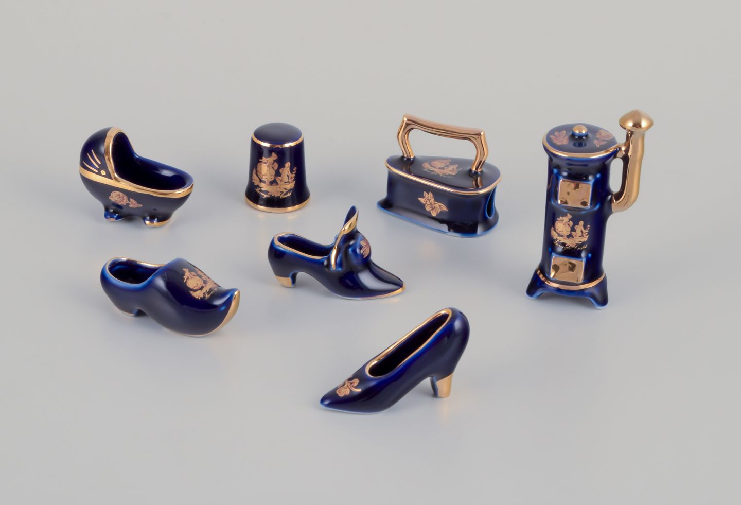 Limoges, Frankrig. Syv dele porcelæn. Miniaturer. Dekoreret i 22-karat bladguld. Smuk kongeblå glasur. Scène galante.