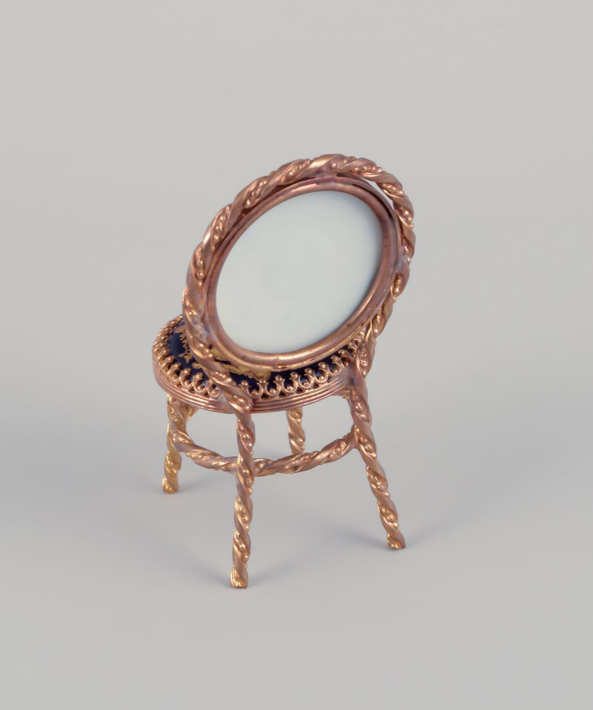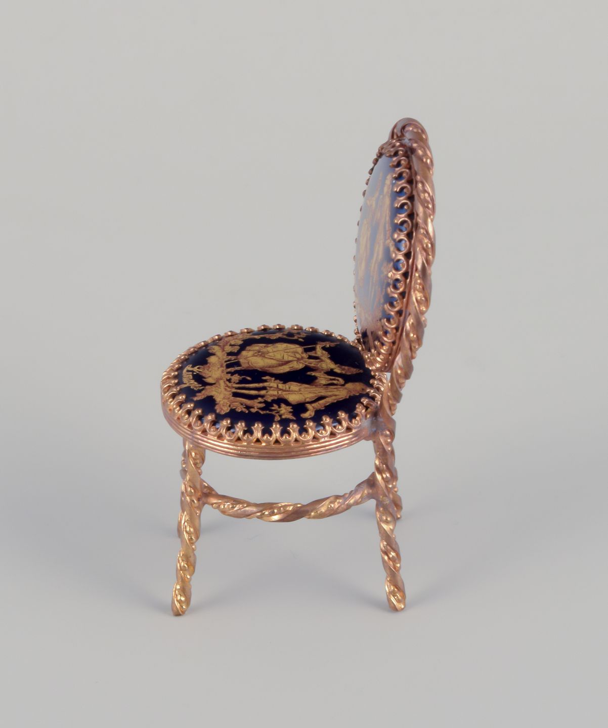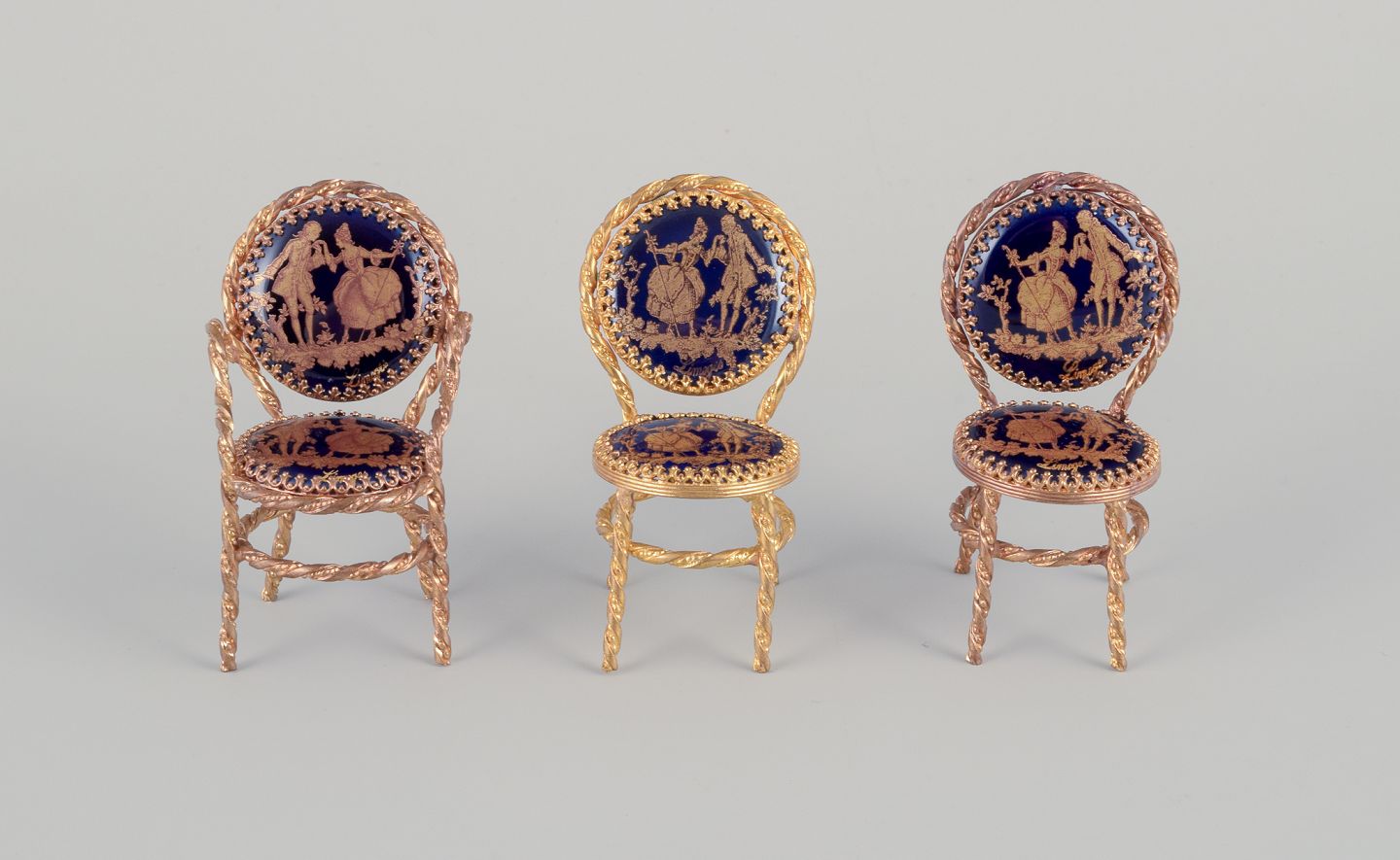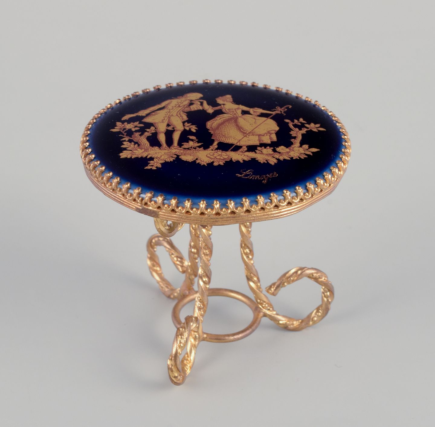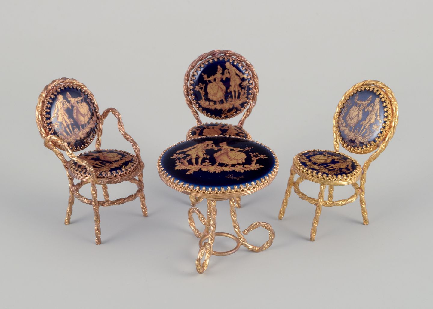 Limoges, Frankrig. Miniature bord og stole i messing og porcelæn. Dekoreret i 22-karat bladguld. Smuk kongeblå glasur. Scène galante.