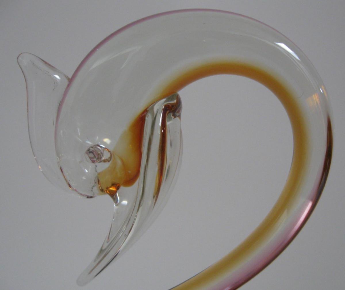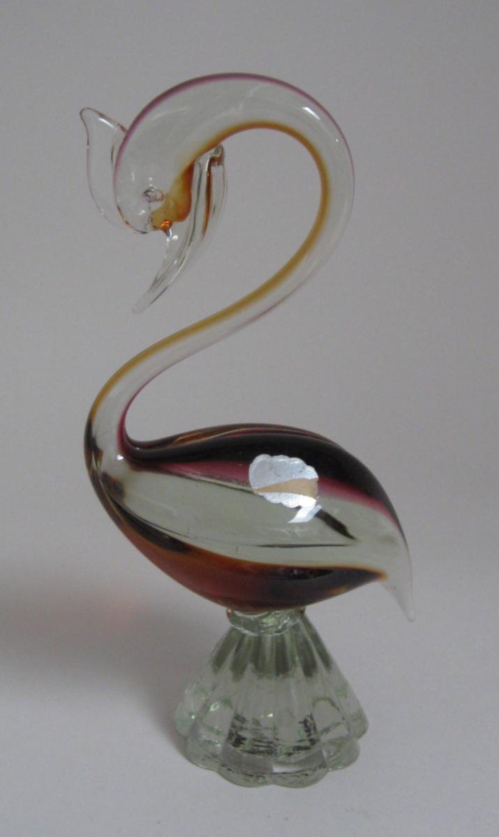 Venezian bird in glass, ca.1960. In purpel/ yellowish glass with overlay in clear glass. Foot in cone-shaped clear glass. H: 27 cm. With original label:  Made in Venice, Italy. Beautiful condition.