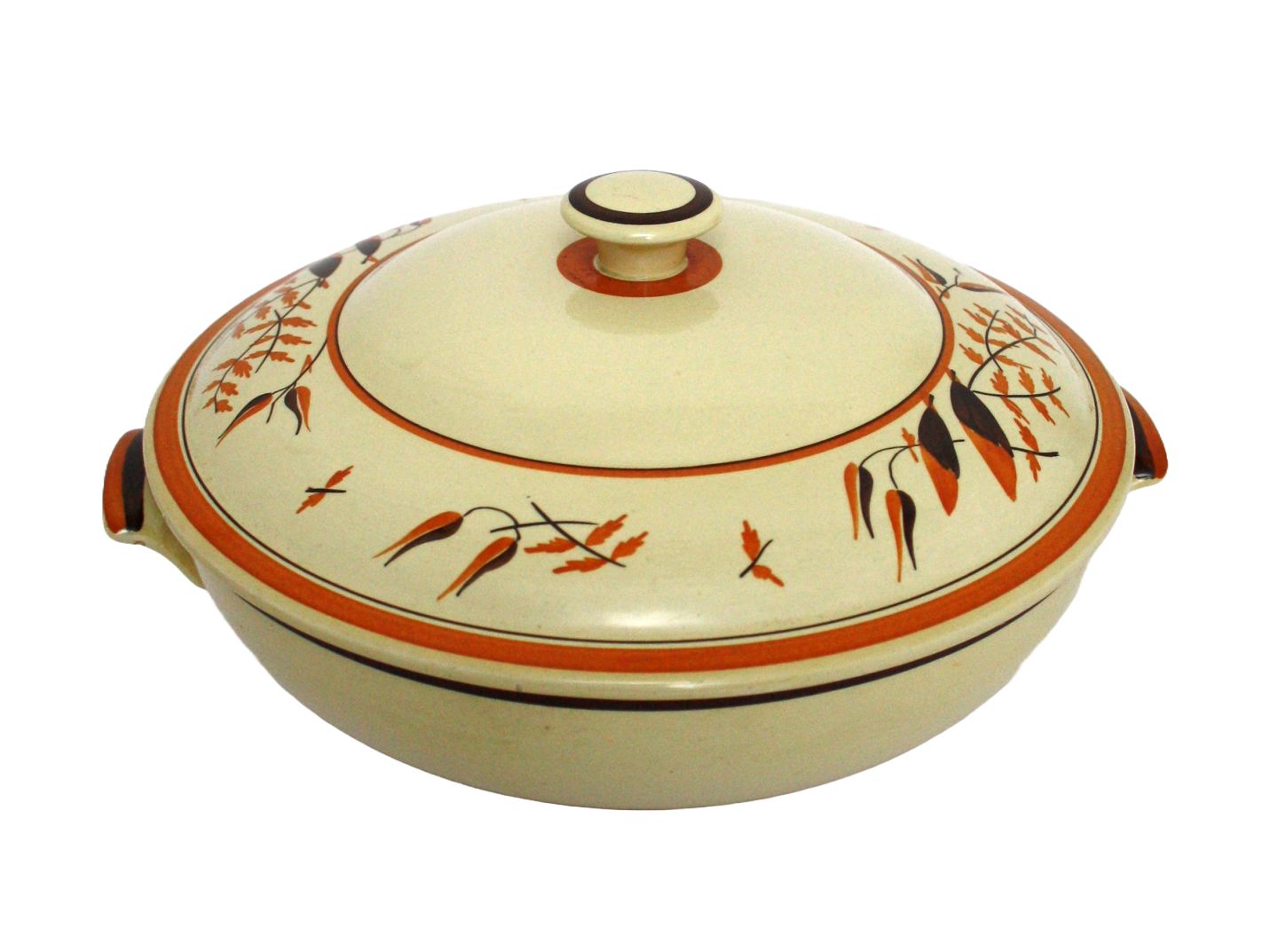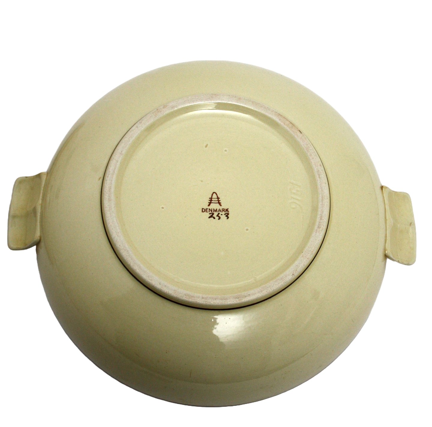 Text available in Danish: Aluminia, Aakjær dek.nr. 253, håndmalet. Designet af Thorkild Olsen. Produceret i perioden 1934-39. Lågterrin. Diameter 23 cm. Højde 13 cm. Flot stand. Pris: 350 kr. stk. Lager: 1