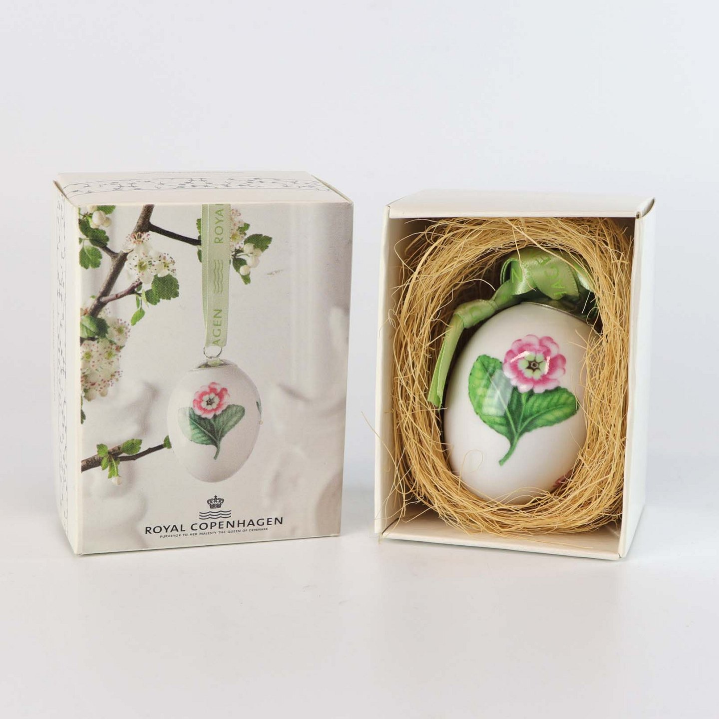 Håndlavet og håndmalet æg af porcelæn med bånd til ophæng. Fra serien Spring kollektion. Motiv af primula. Er i originalæske