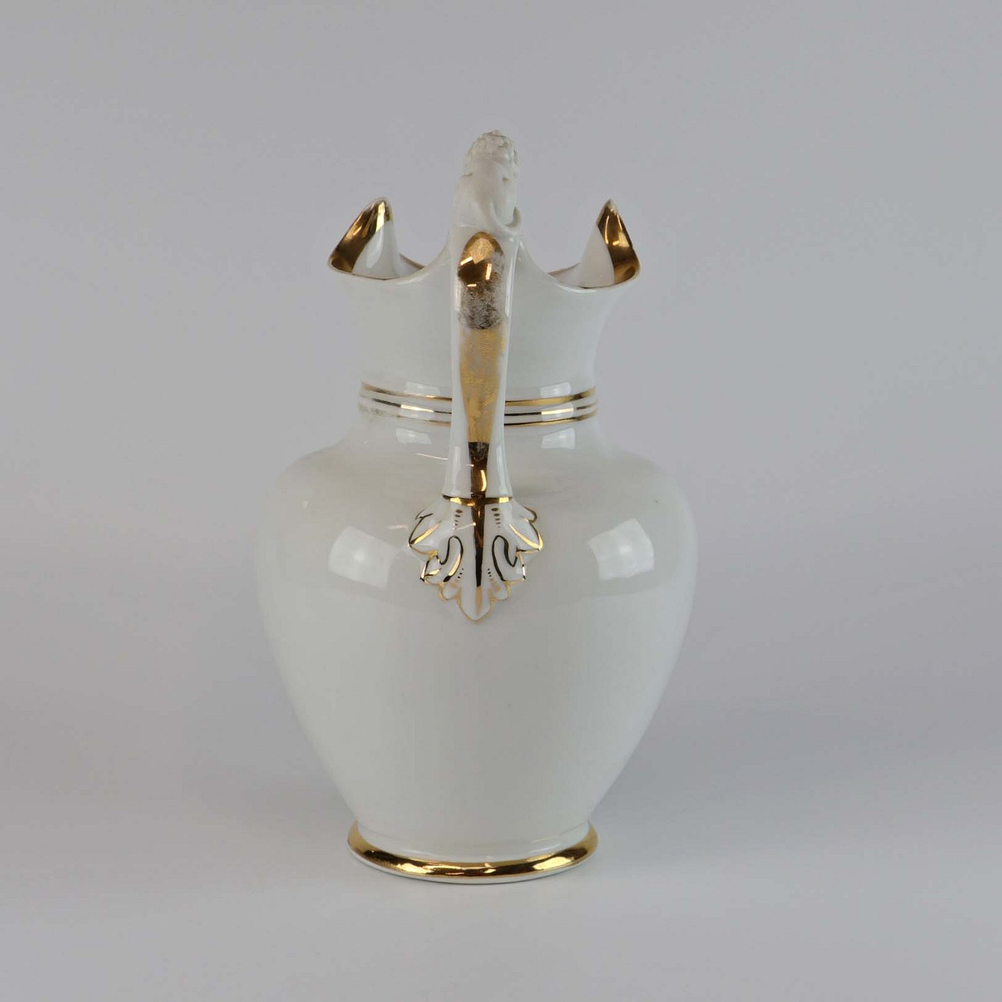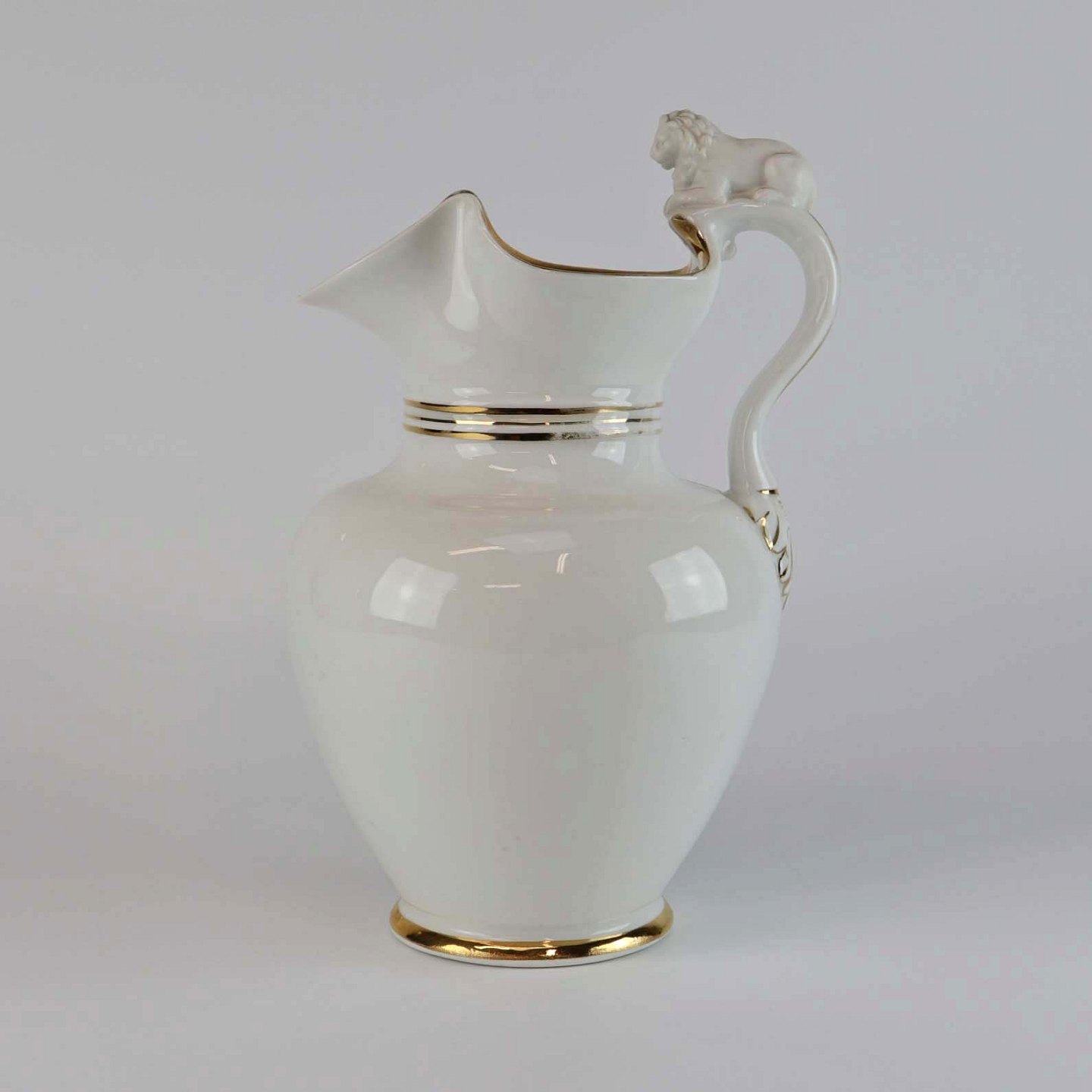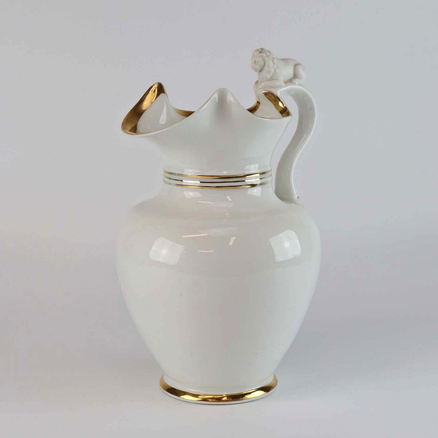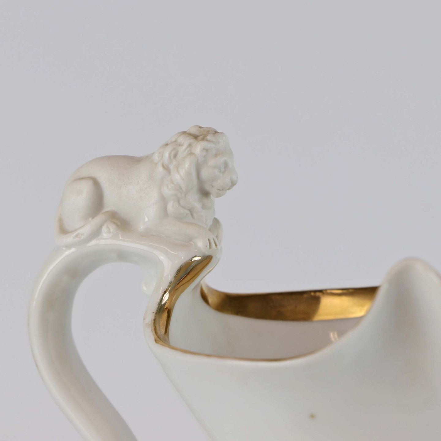 Chokoladekande af porcelæn, dekoreret med en løve på kanten. Kanden er hvid med guldkanter, låg og hank