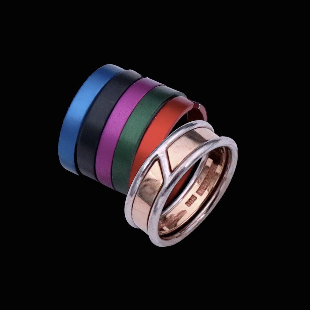 14k White Gold Ring with Yellow Gold insert ring and five colored aluminum insert Rings.