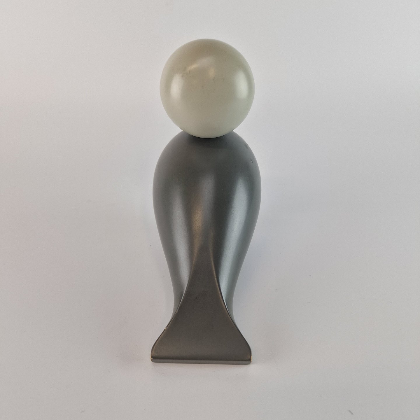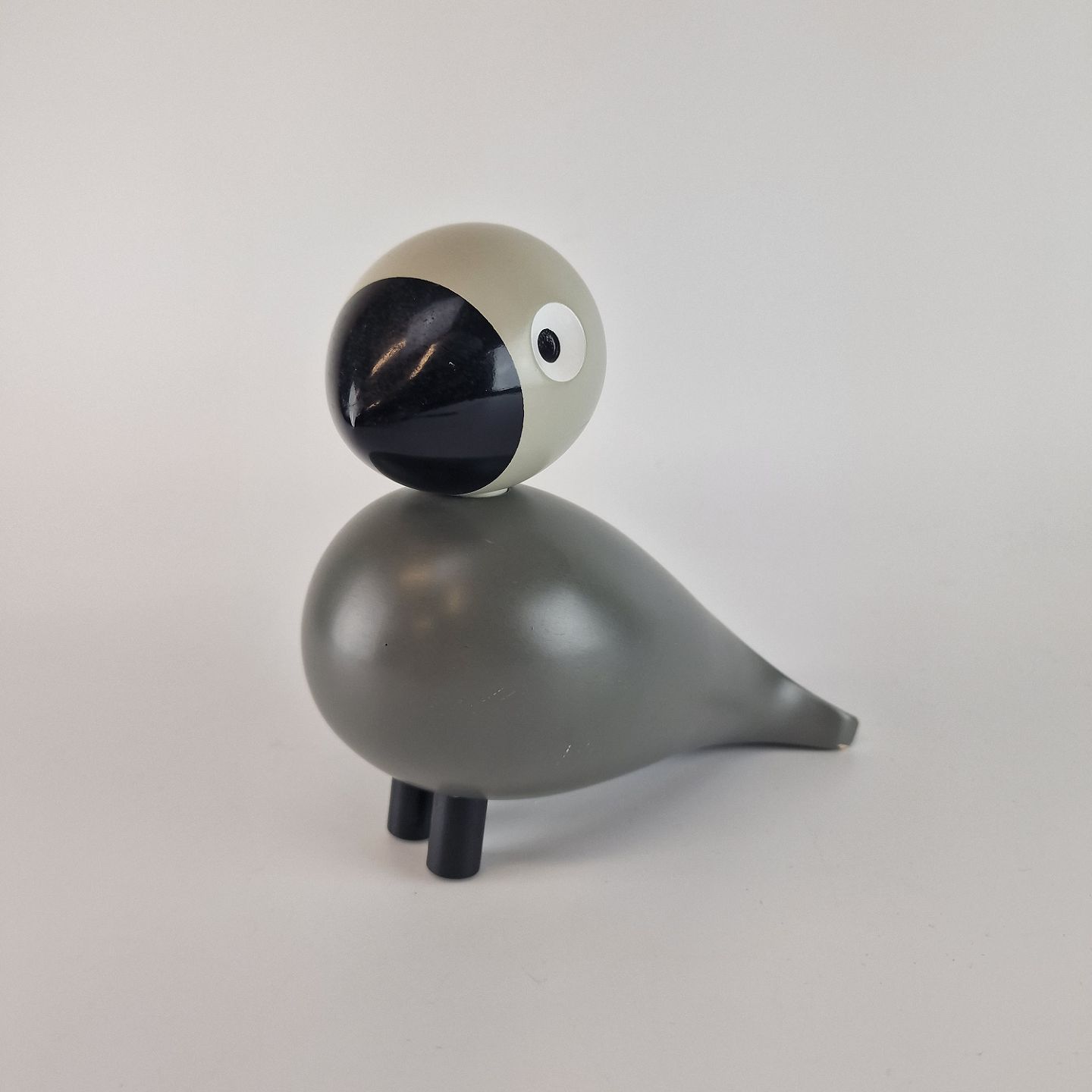 Text available in Danish: Figur af malet bøgetræ fra serien Sangfugl. Ernst har grå krop, lys gråt hoved, sort næb og sorte ben