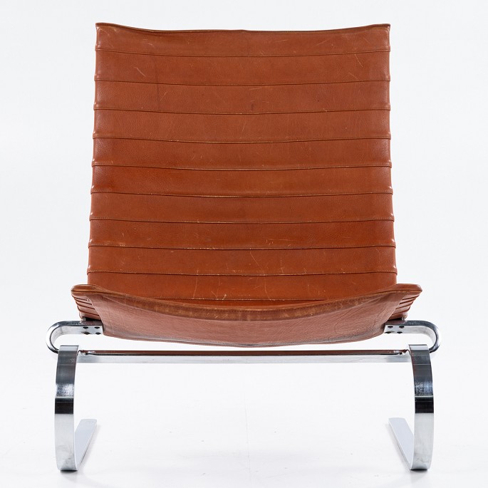 PK 20 - Lænestol i patineret cognaclæder på stel af stål. Stemplet fra producent.