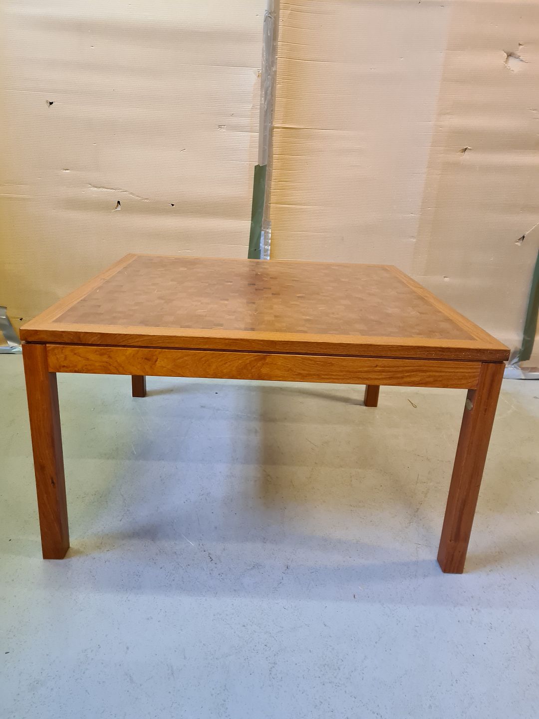 Mosaik sofabord i fineret teaktræ med massivt mosaik i flere træsorter, fra 1970erne.