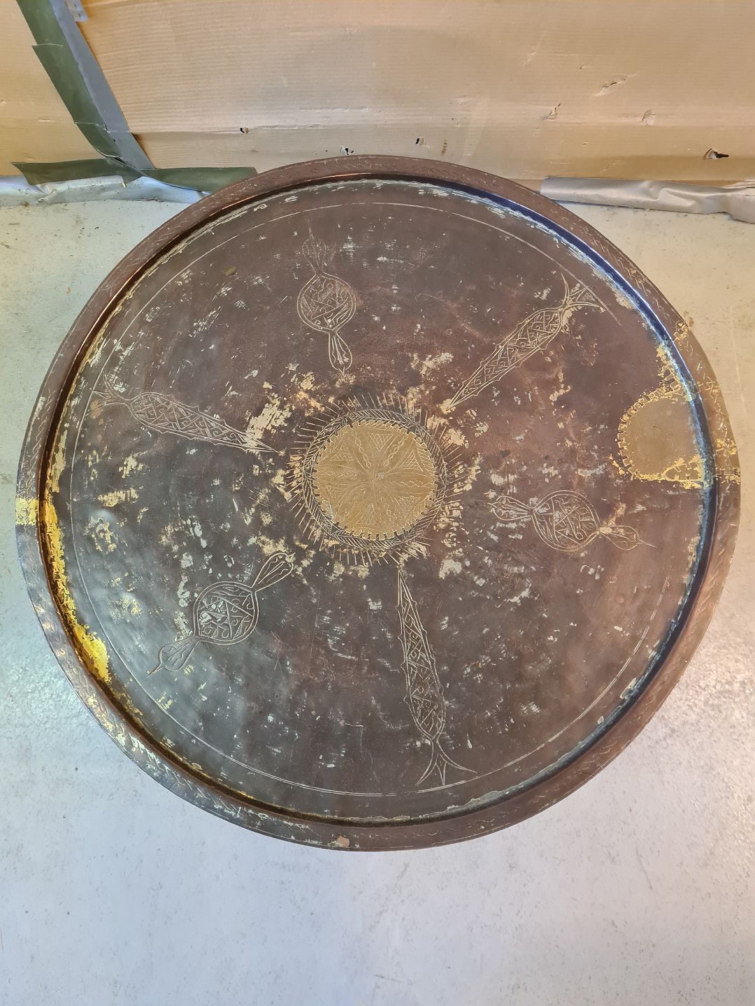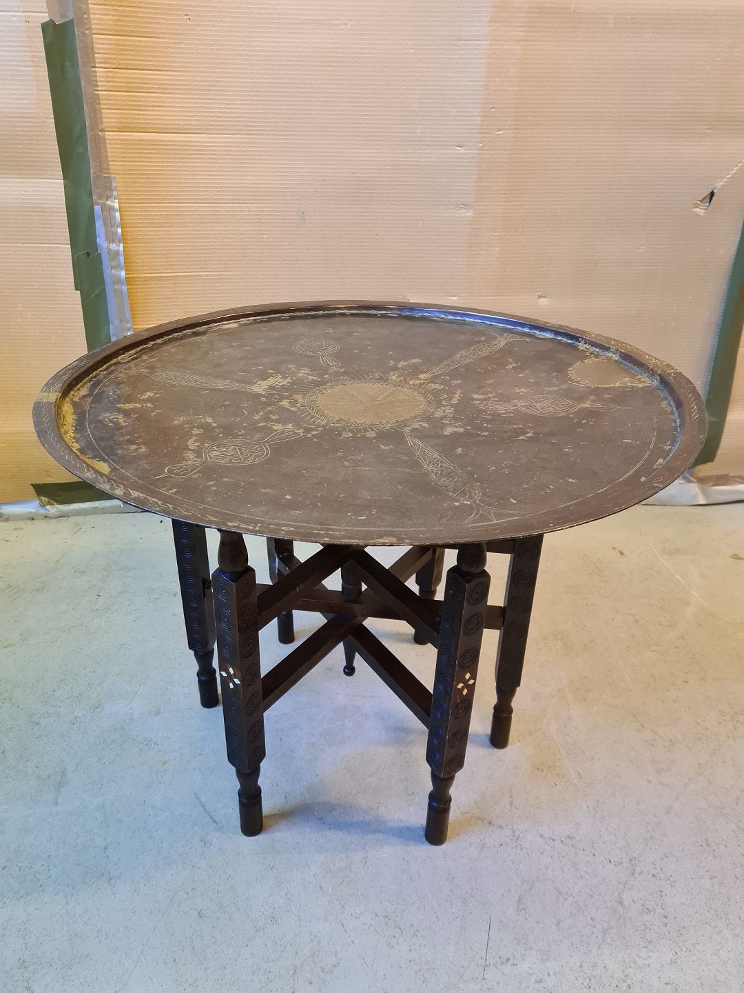 Afghansk bakkebord i træ med kobberplade, fra 1970erne.