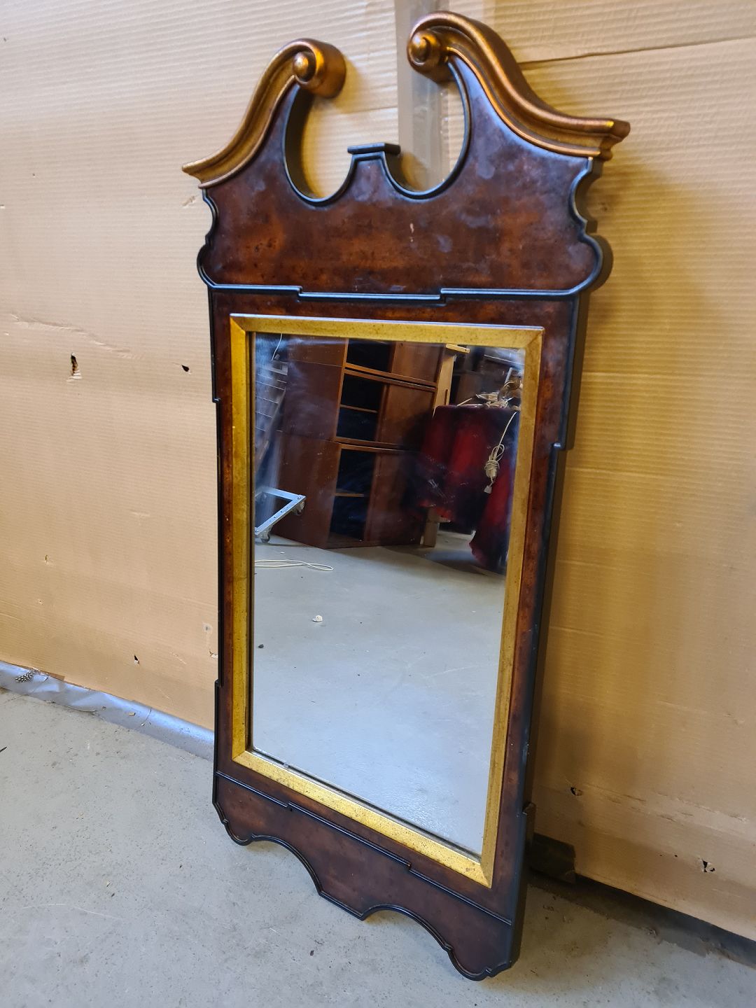 Spejl i fineret nødetræ med guldbelægning, fra 1920-1930erne.