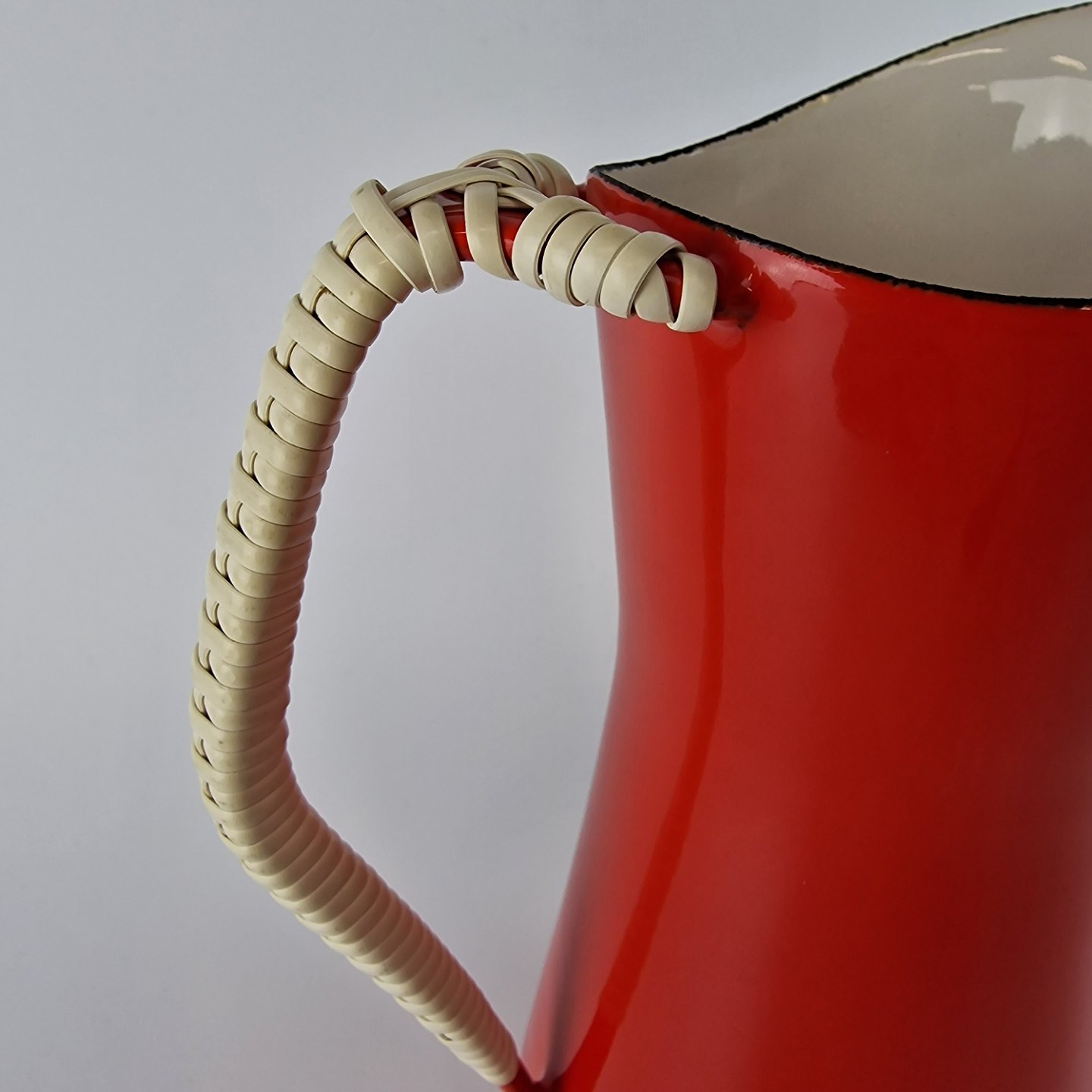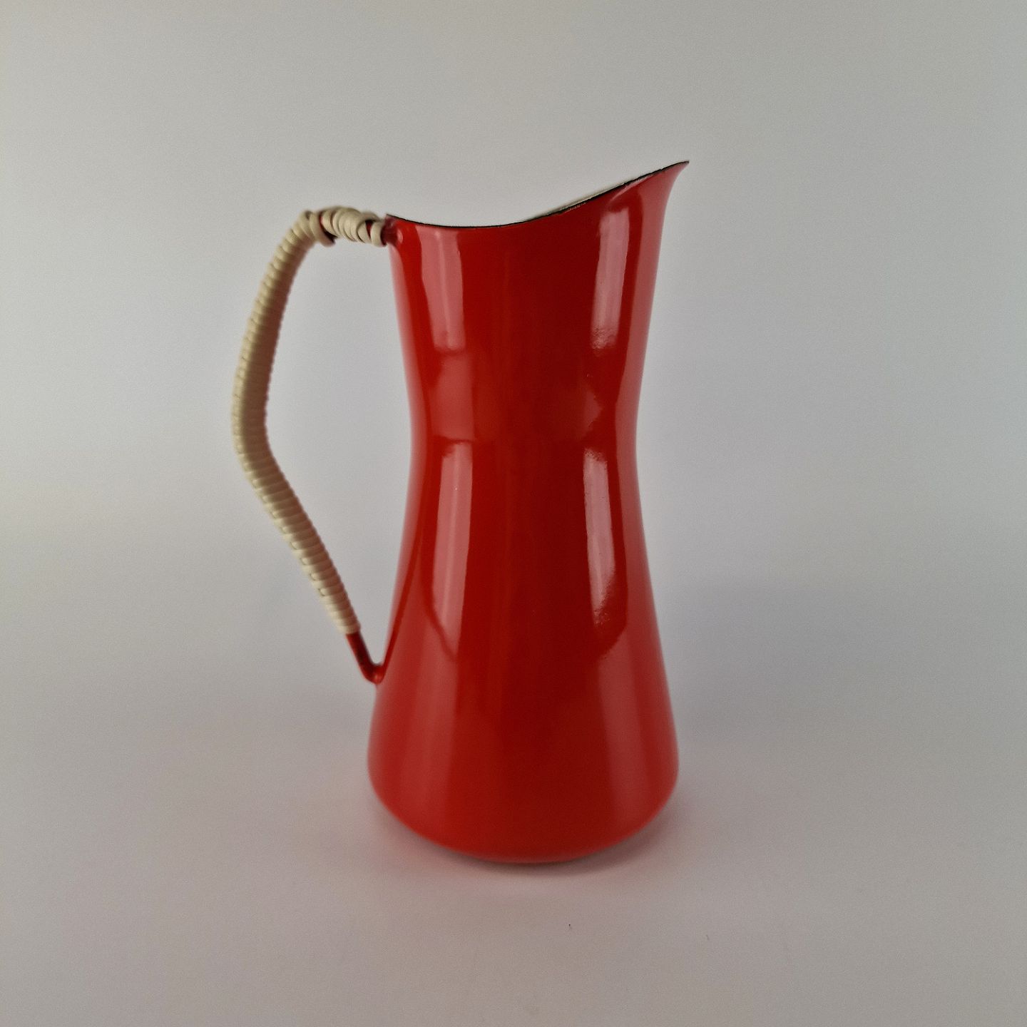 Orangerød kande af emalje. Hanken er beklædt med flettet plast
