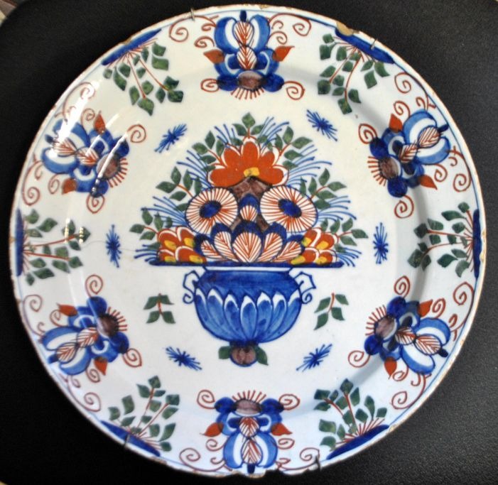 Polykromt dekoreret fajance fad, "Peacock", Stilblandingen, ca. 1760. Delft, Holland.  Dekoreret med blomster i vase. Dia.: 34 cm.