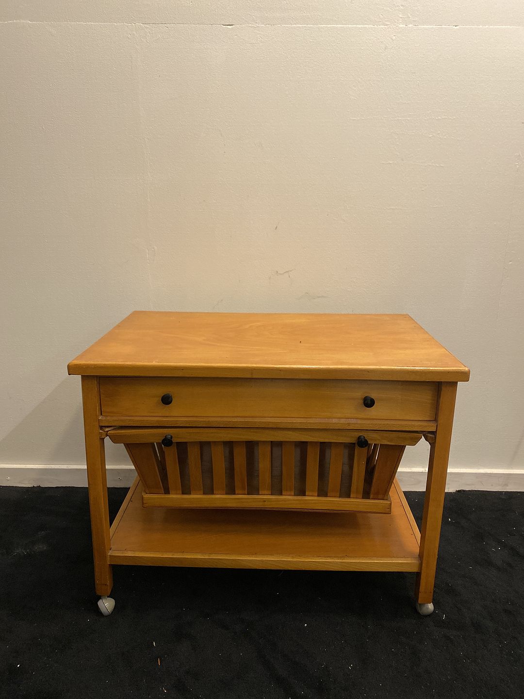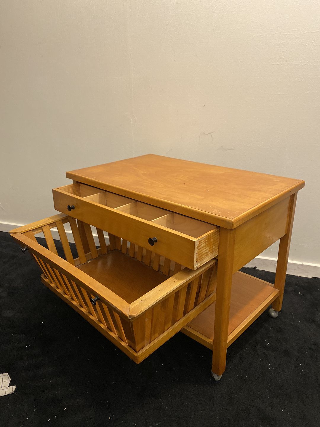 Sybord i eg på hjul og med skuffe og kurv. Fremstår pænt, velholdt og udmærket funktionelt uden nævneværdige brugsspor.
