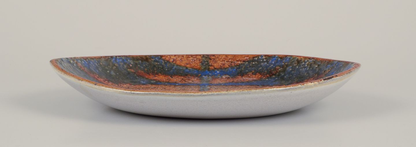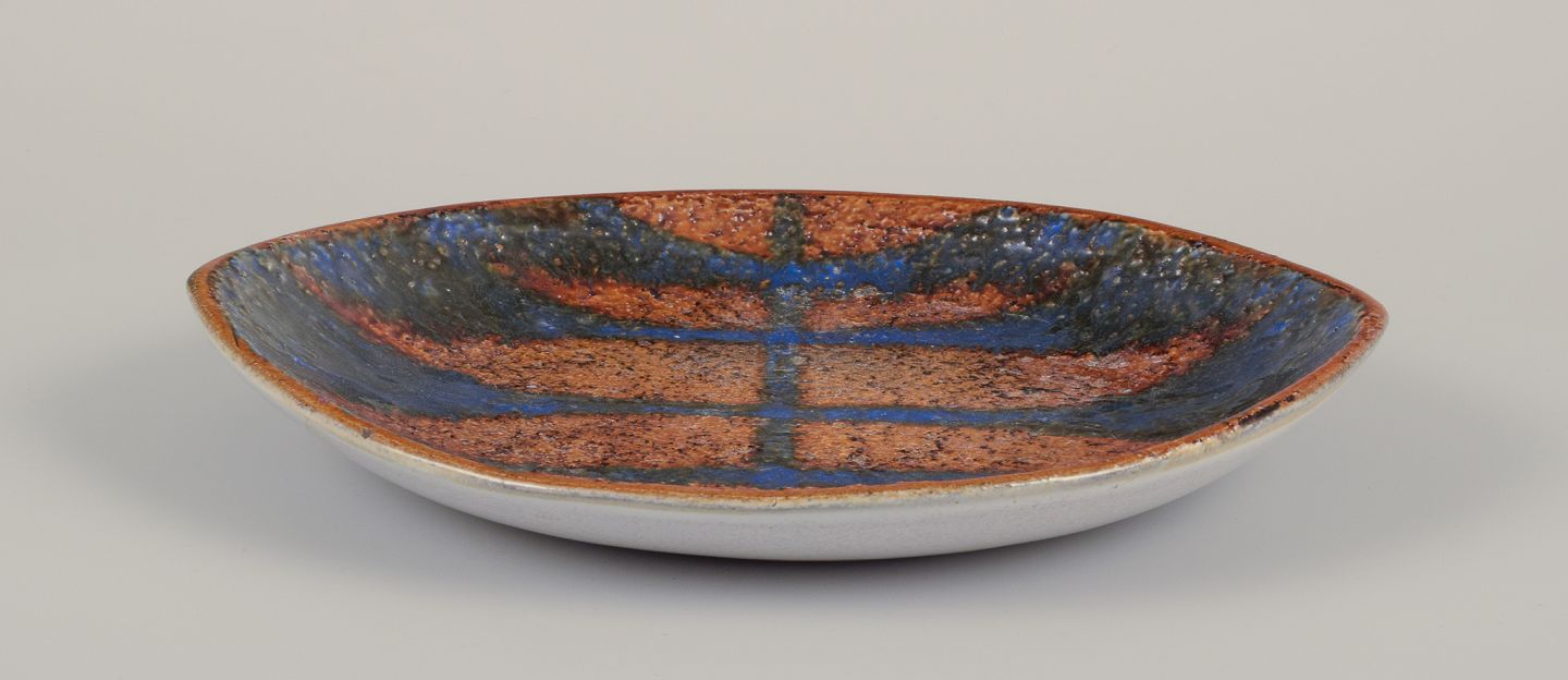 Mari Simmulson for Upsala Ekeby, Sverige. Lav skål i keramik. Glasur i blålige og okkergule toner.