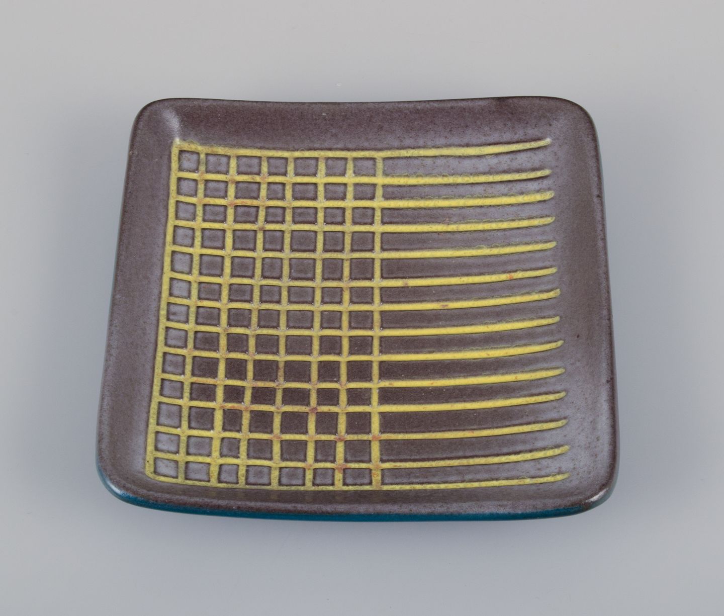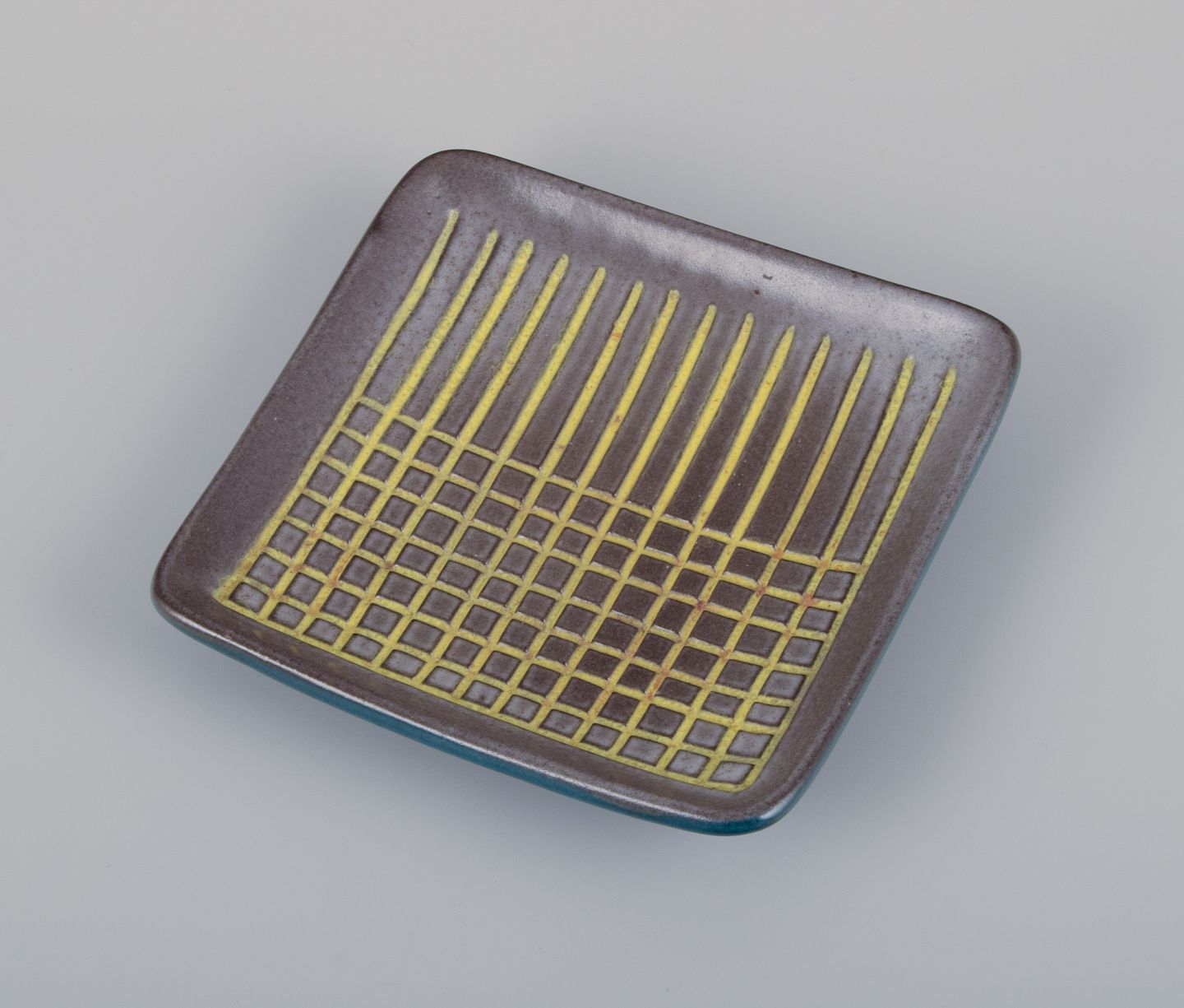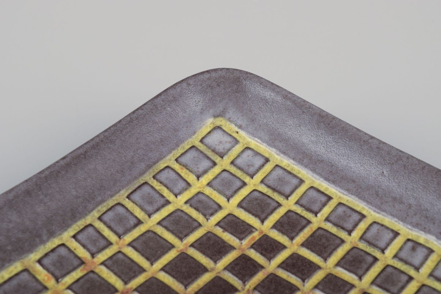 Hjördis Oldfors (1920-2014) for Upsala Ekeby. Ceramic tray with glaze in yellow, brown, and blue tones. Geometric pattern.