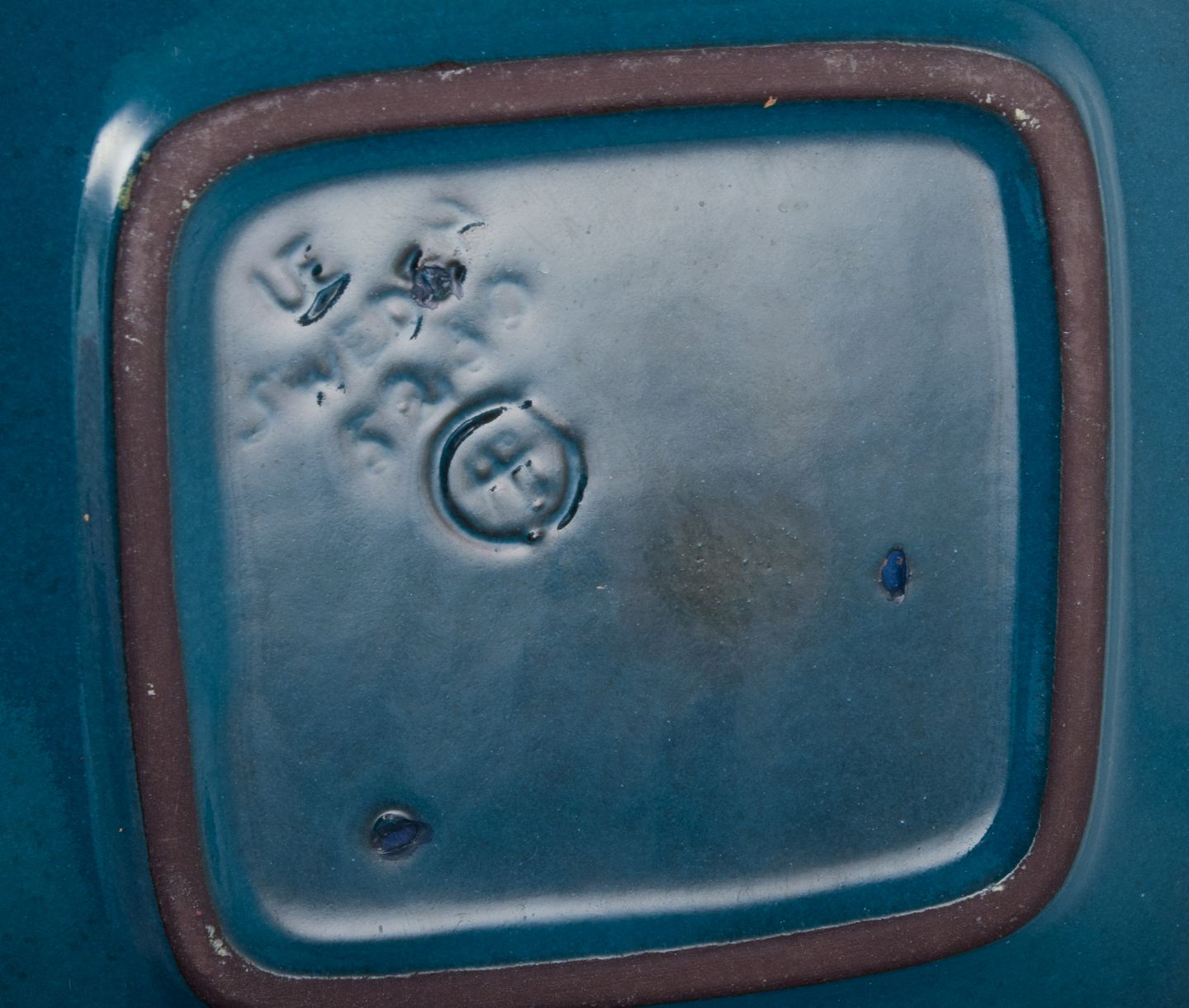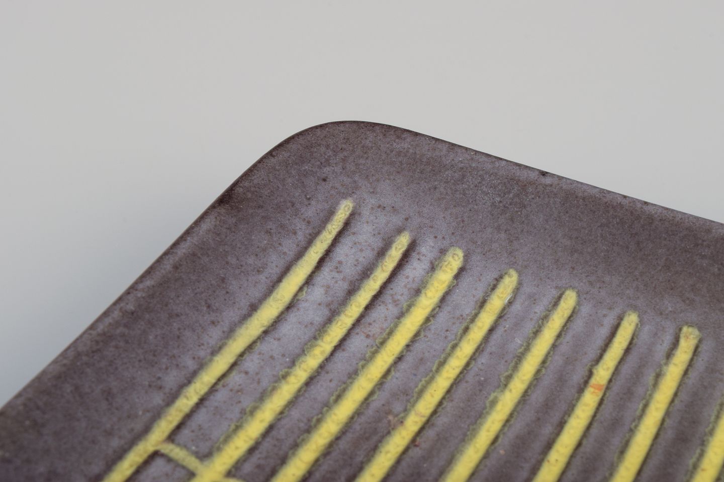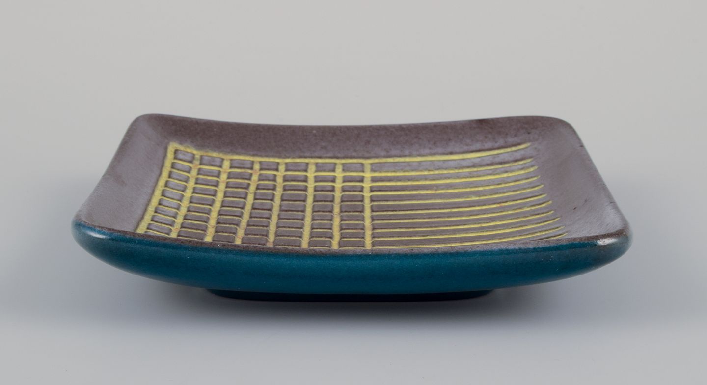 Hjördis Oldfors (1920-2014) for Upsala Ekeby. Ceramic tray with glaze in yellow, brown, and blue tones. Geometric pattern.