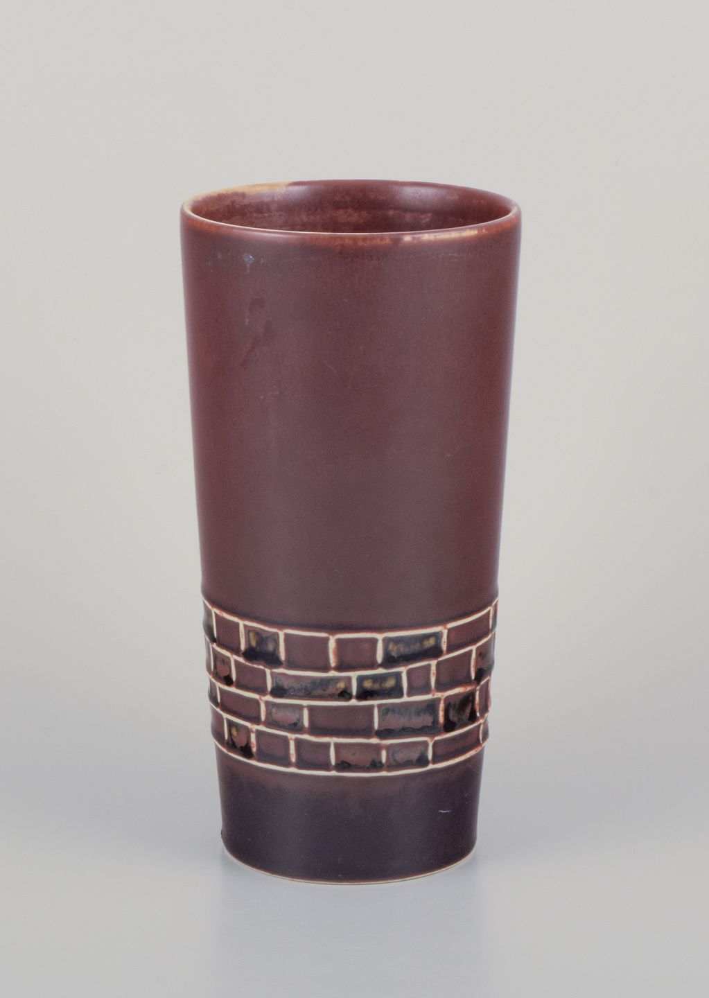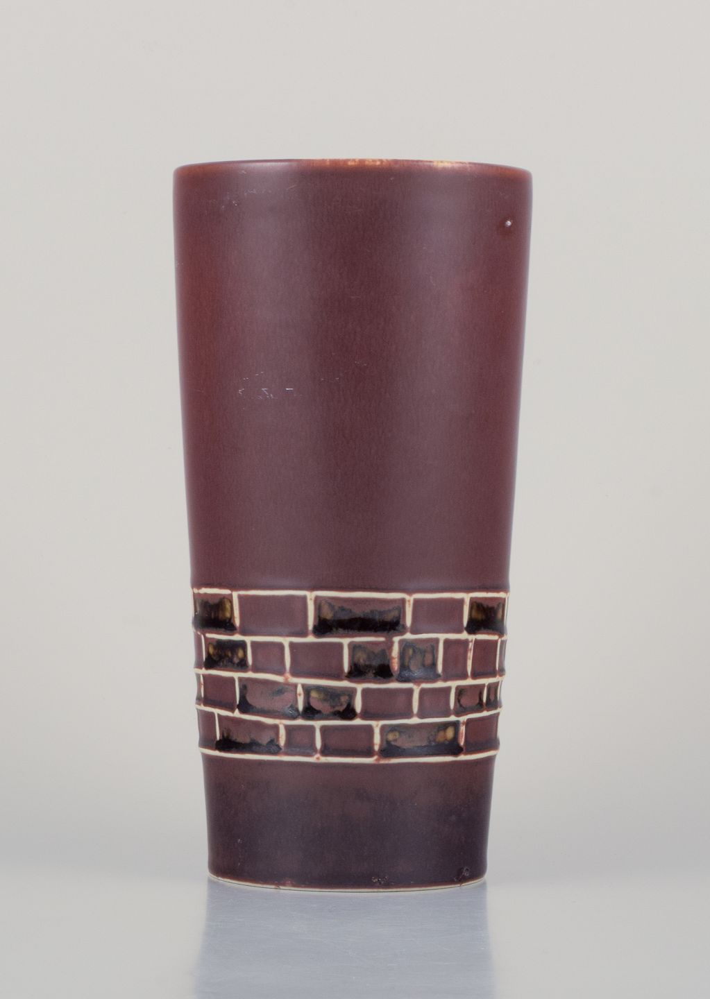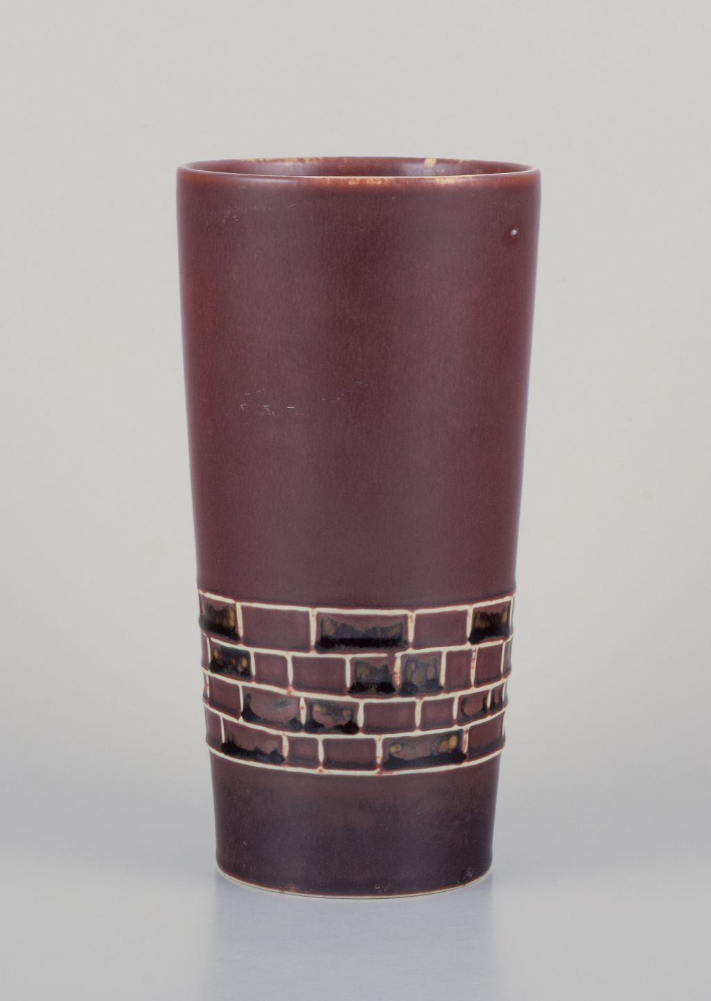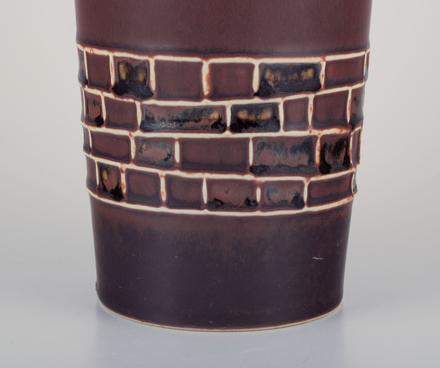 Hertha Bengtsson (1917-1993) for Rörstrand. Keramikvase med glasur i brune nuancer. Geometriske felter.