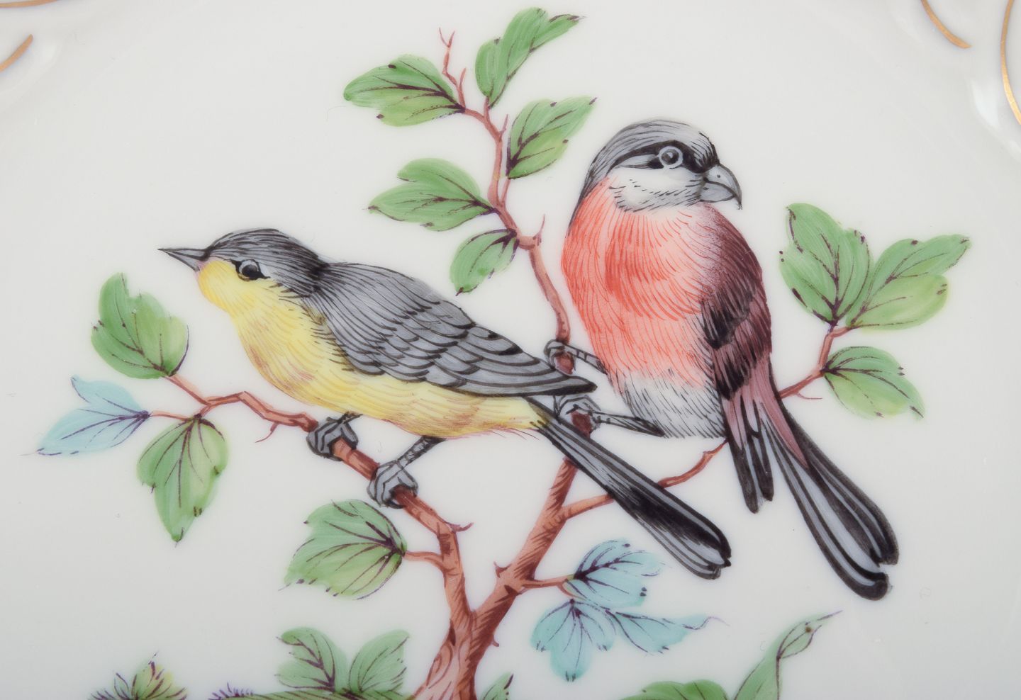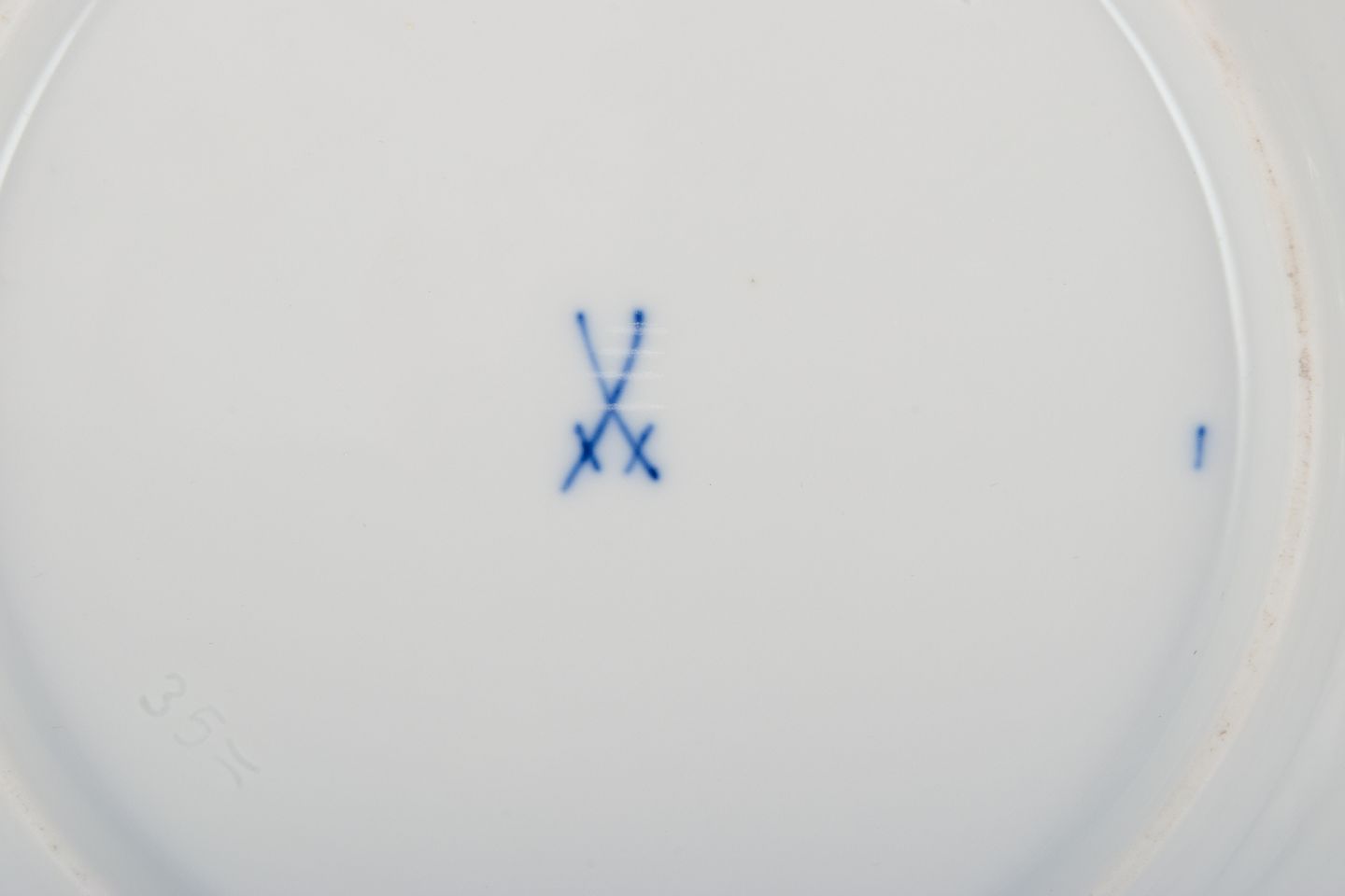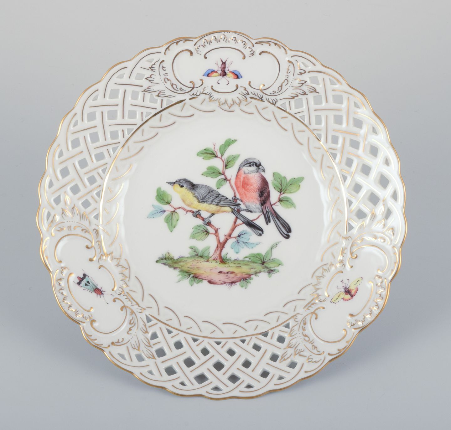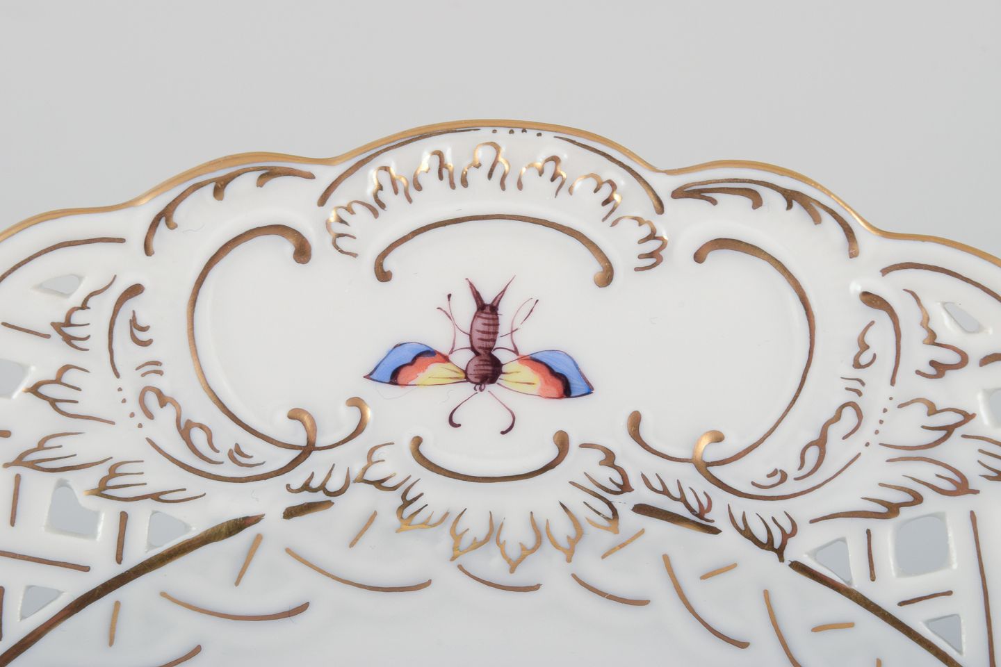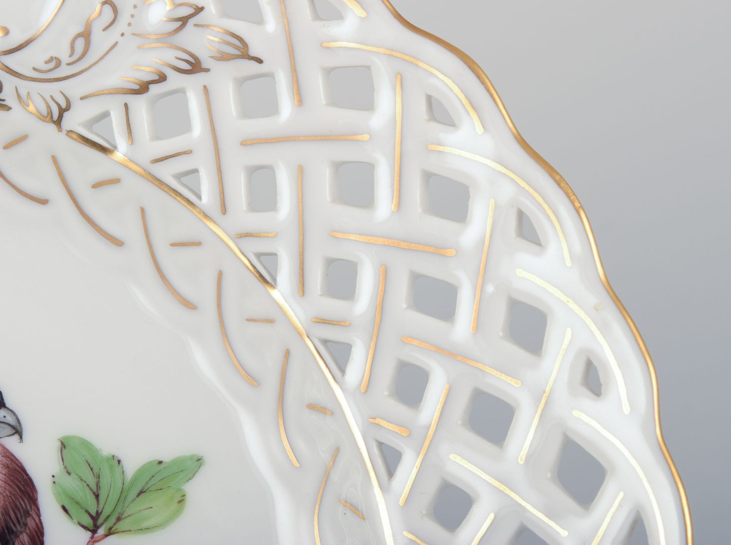 Meissen, Tyskland. Gennembrudt porcelænstallerken. Håndmalet med fuglemotiv og insekter, guldkant.
