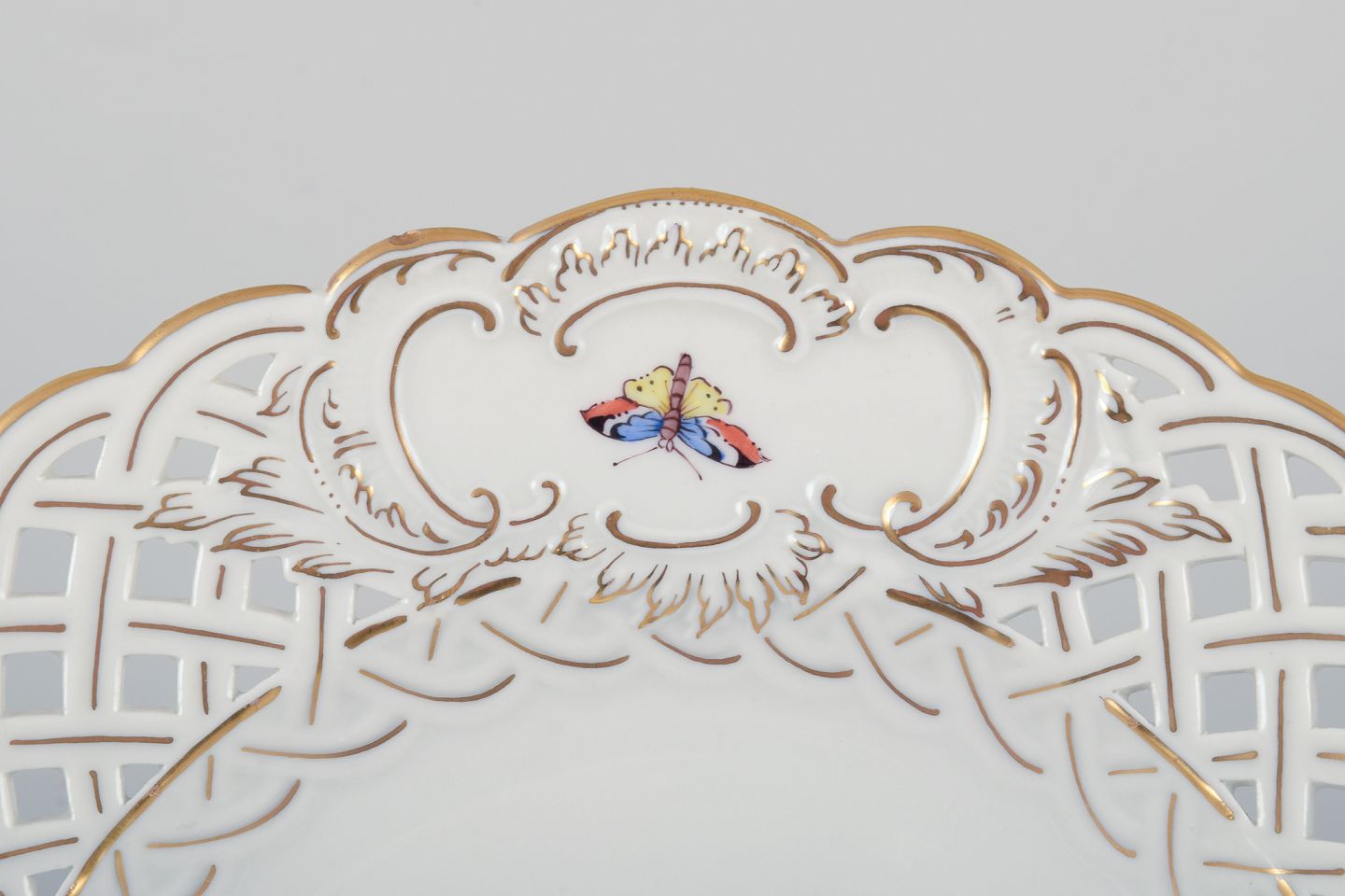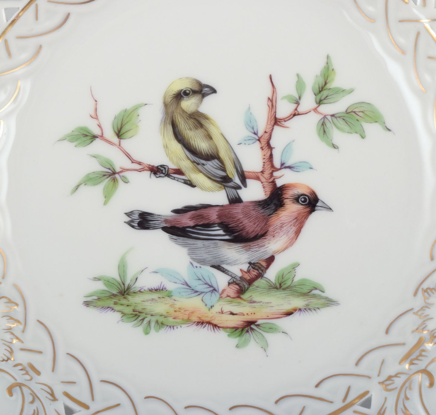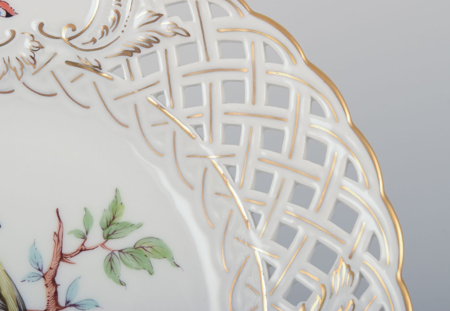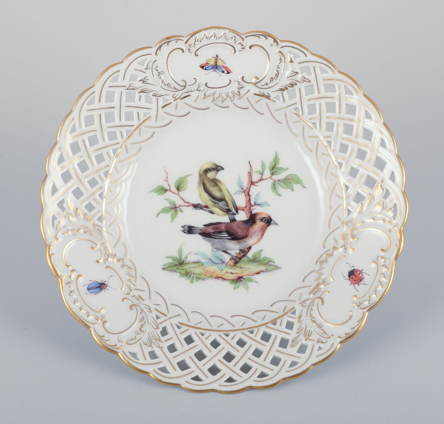 Meissen, Tyskland. Gennembrudt porcelænstallerken. Håndmalet med fuglemotiv og insekter, guldkant.
