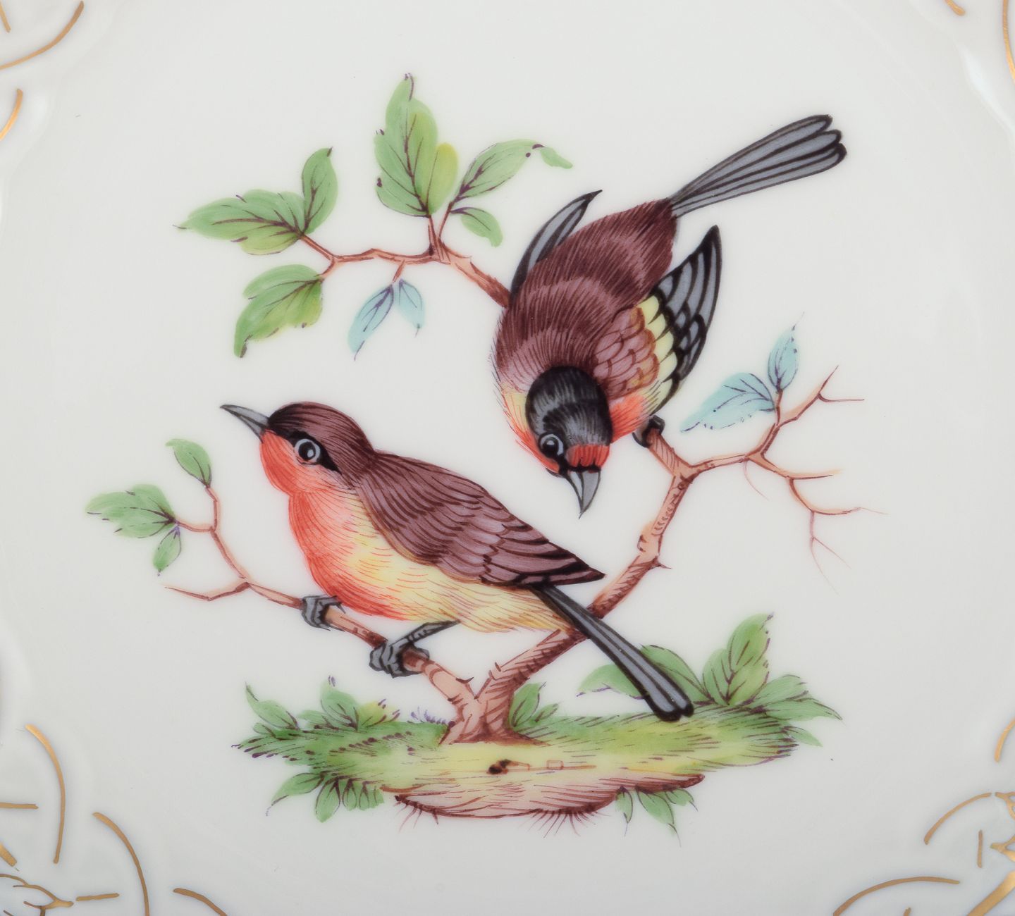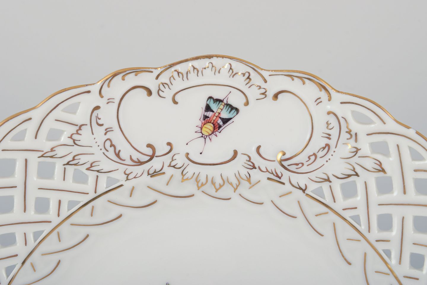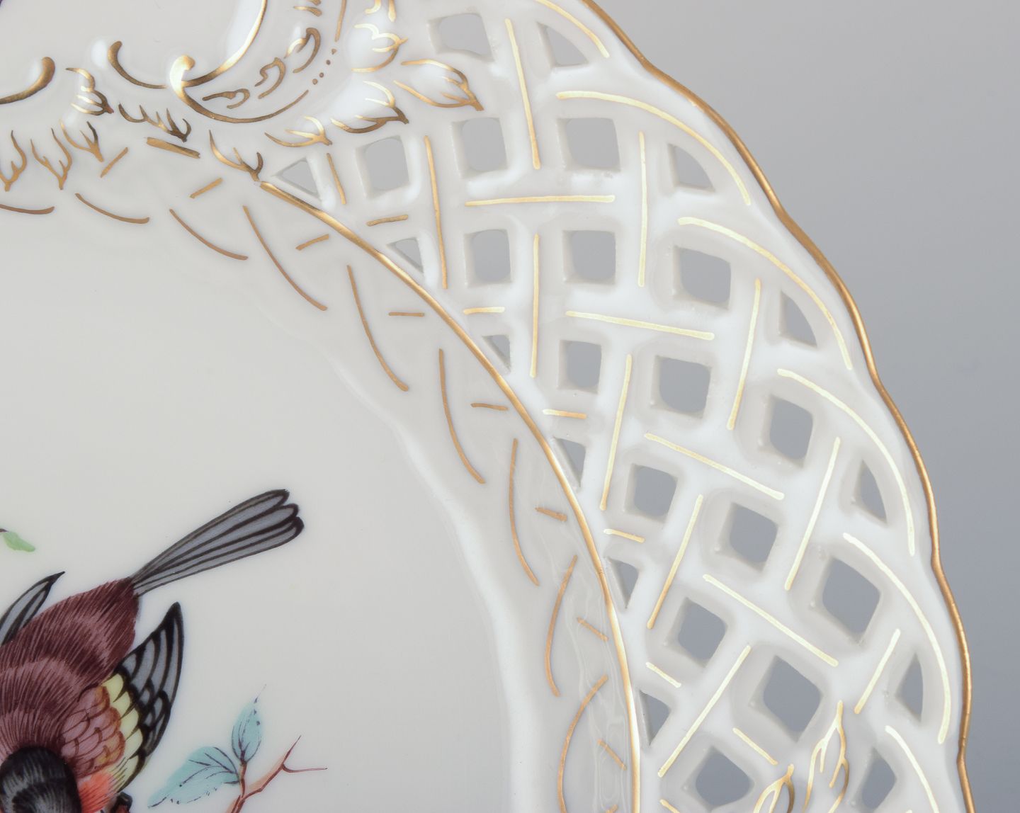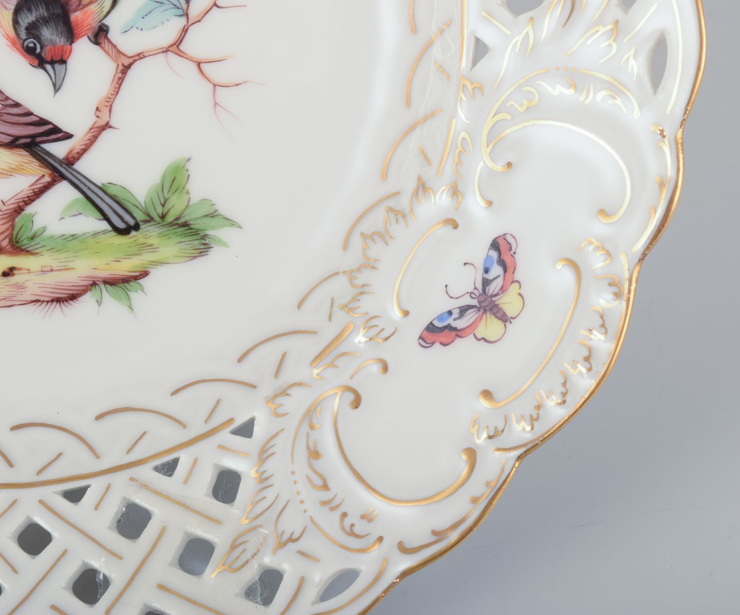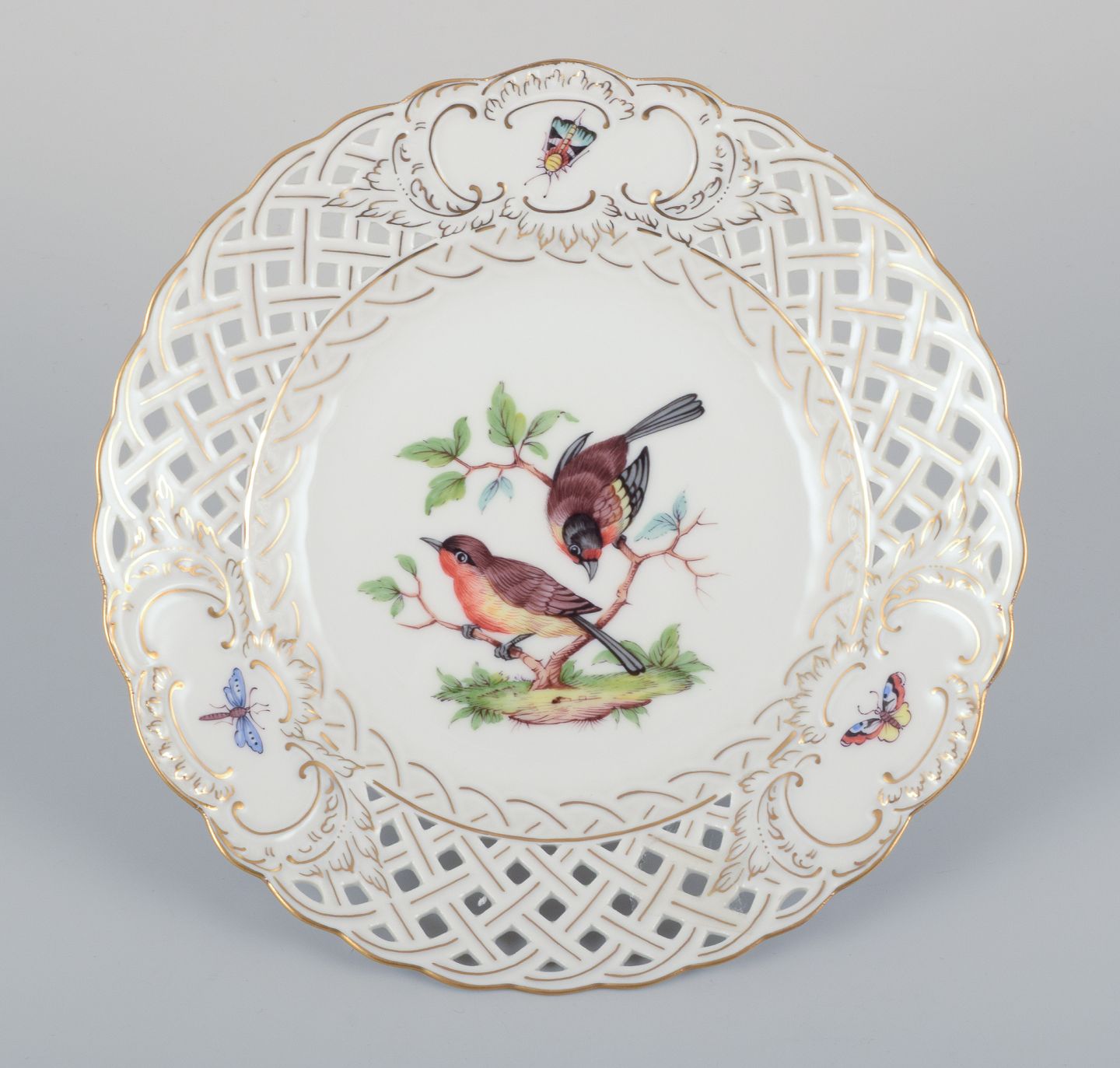 Meissen, Germany. Open lace porcelain plate. Hand-painted with a bird motif and insects, gold trim.