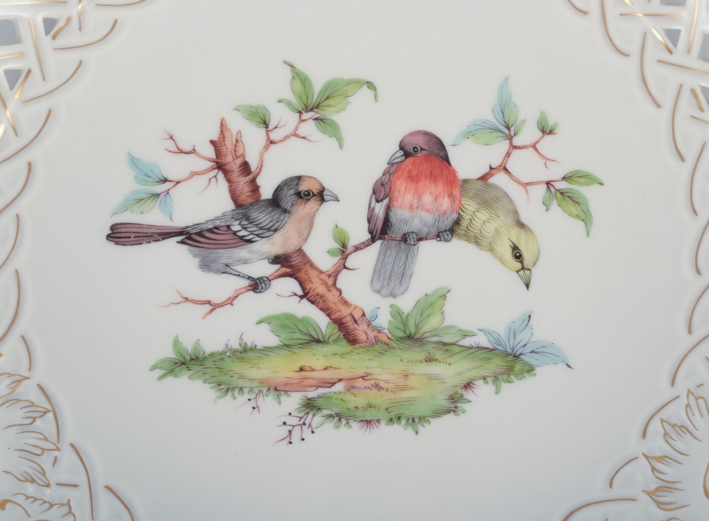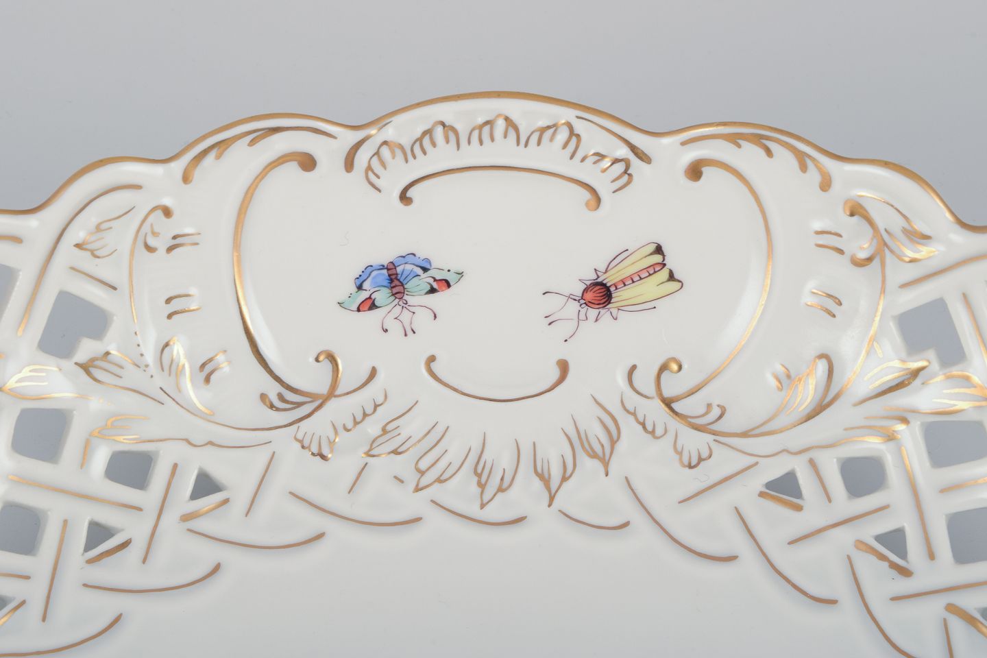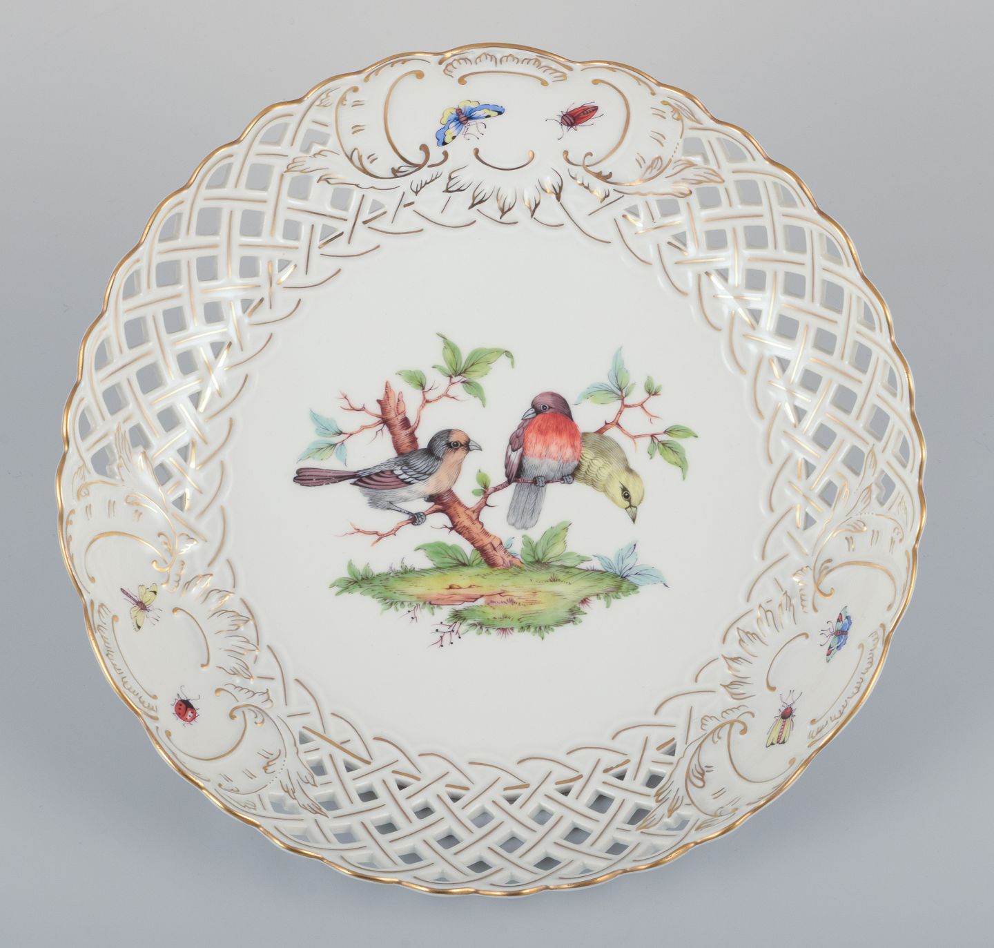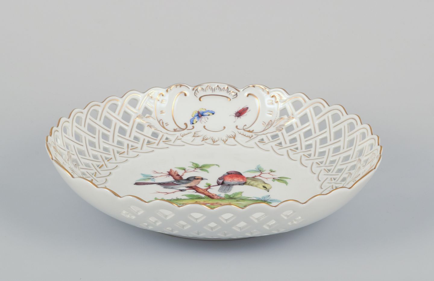 Meissen, Tyskland. Stor gennembrudt skål. Håndmalet med fuglemotiv og insekter, guldkant.