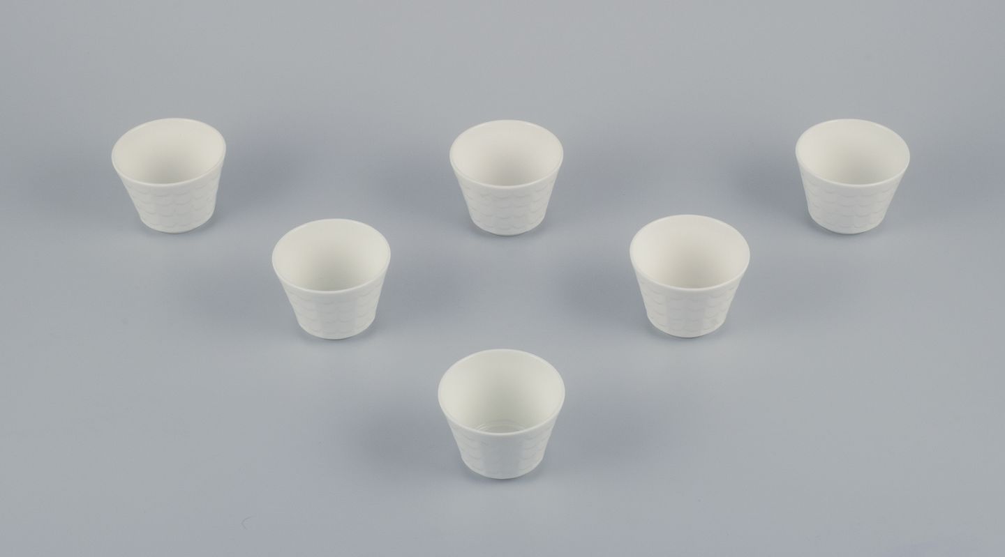 Wilhelm Kåge for Gustavsberg. Seks hvide urtepotteskjulere i porcelæn.