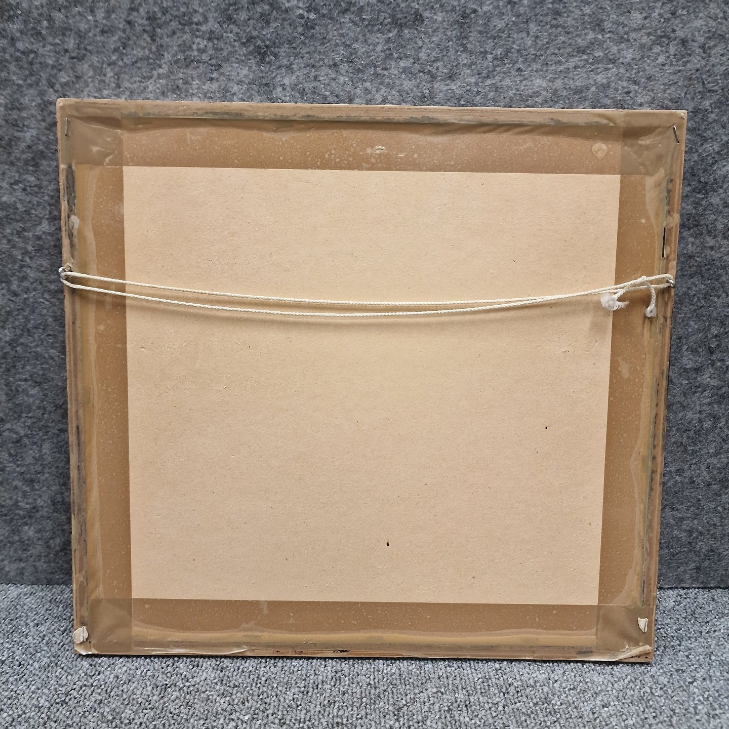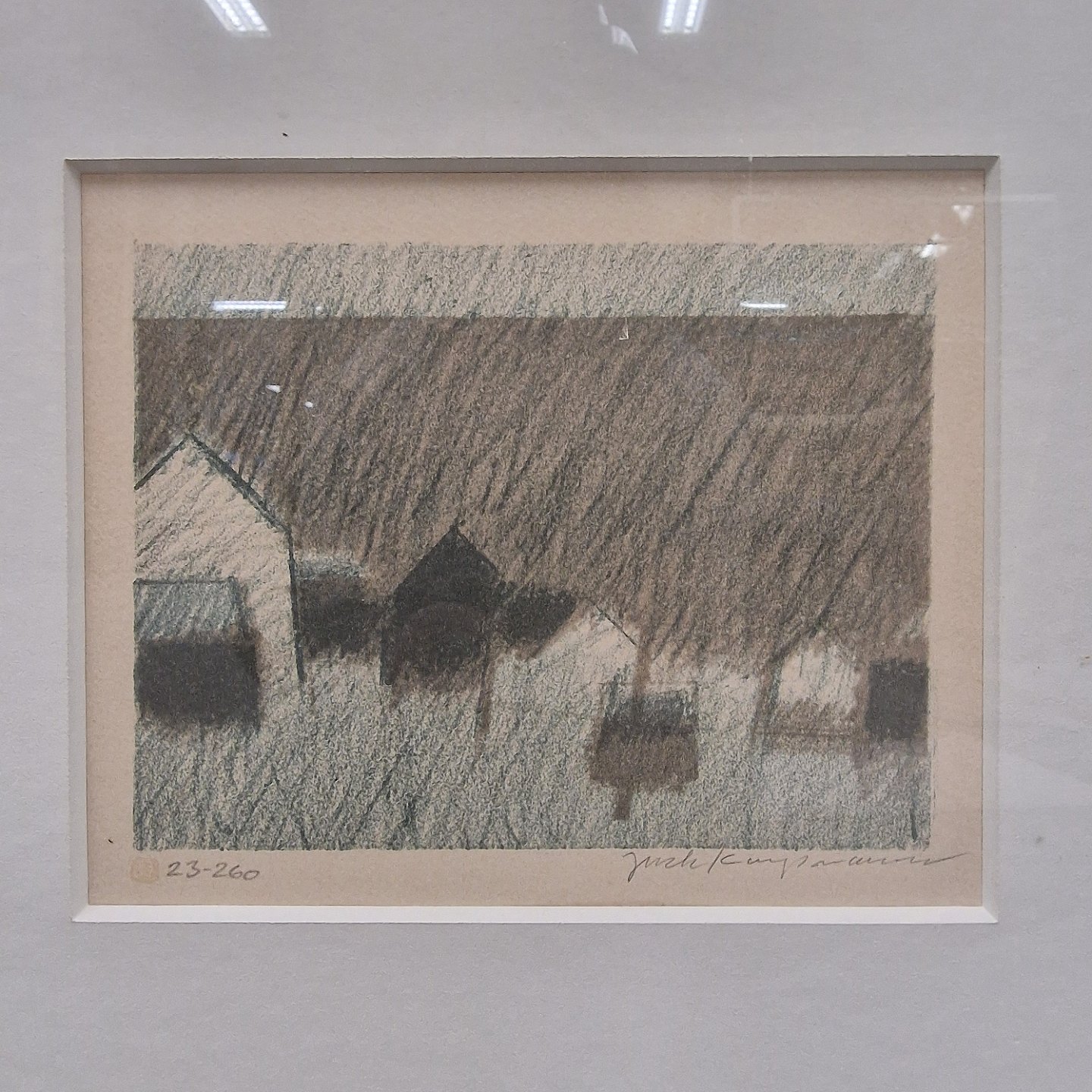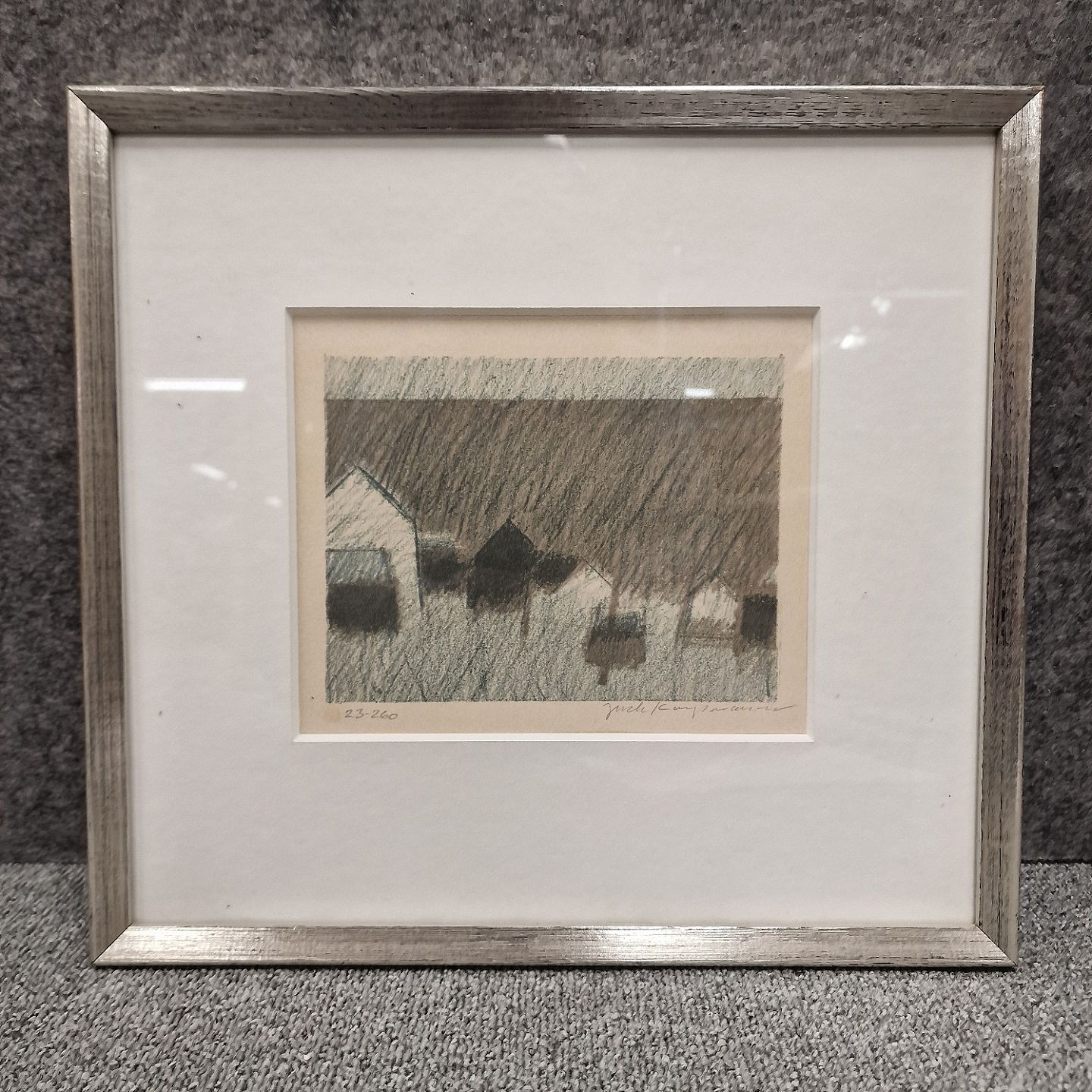 Indrammet litografi nr 23/260 med motiv af huse ved havet. Formentlig fra Færøerne