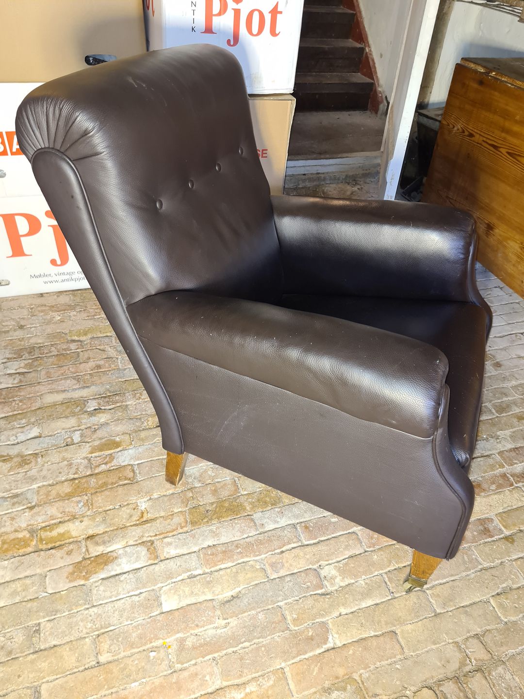 Overpolstret lænestol i brunt læder, med ben af egetræ, fra 1930.