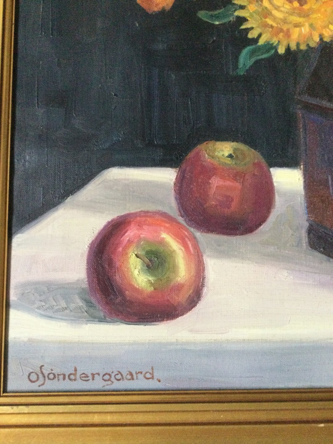 Maleri - Oluf Søndergaard - "Opstilling med æbler og vase med morgenfruer"