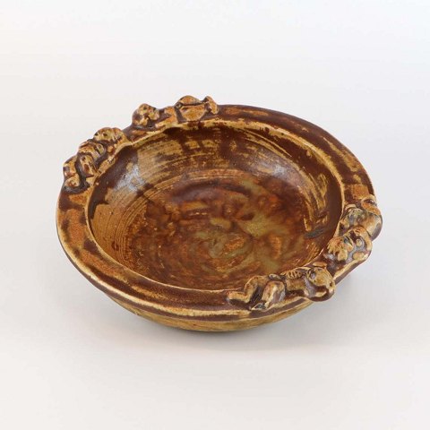 Lav skål af stentøj. Kanten er dekoreret med figurer af liggende mennesker
