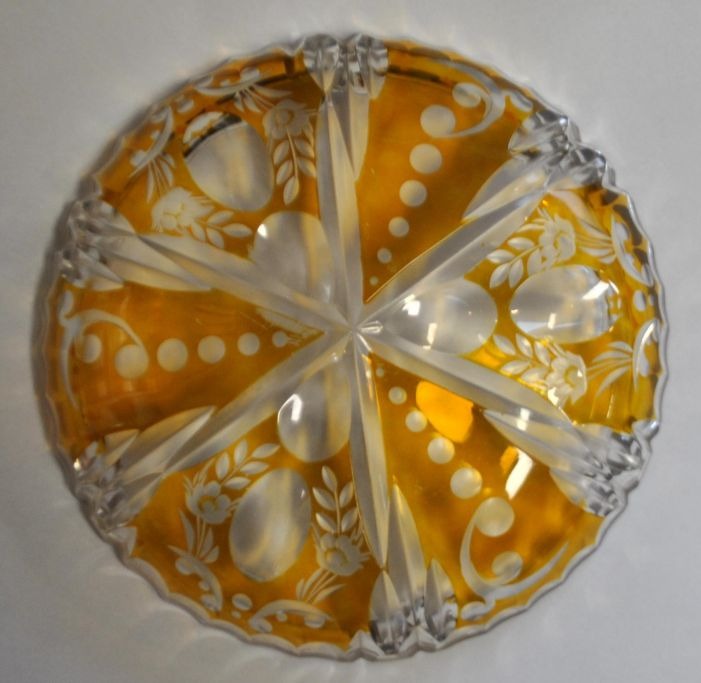 Sæt på 8 Böhmiske dessertskåle/isasietter i krystal, 20 år. Klar krystal med gult überfang med slibninger. Dia.: 14,5 cm.