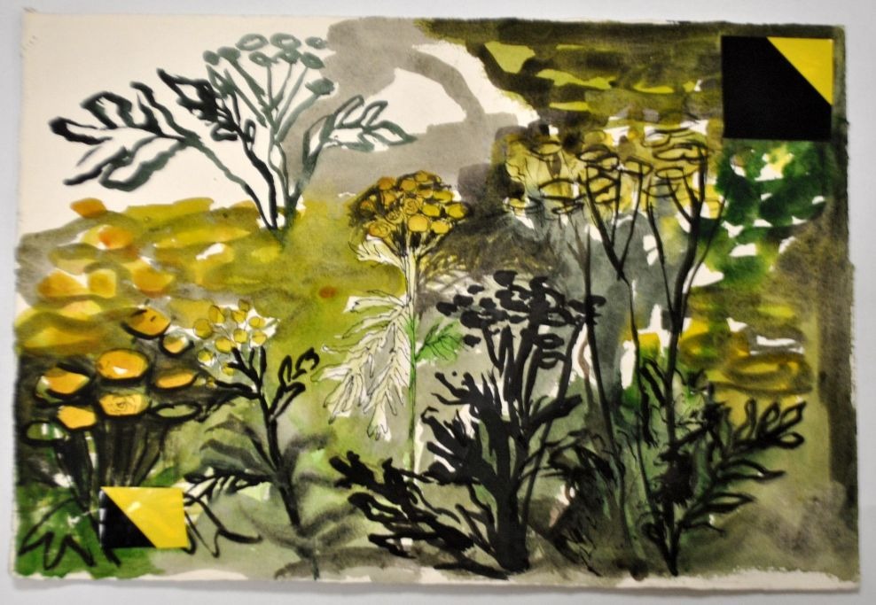 Degett, Karen (1954 - 2011) Danmark. Komposition med sorte og gule blomster. Blandform. Usigneret. 27 x 40 cm. Uindrammet.
