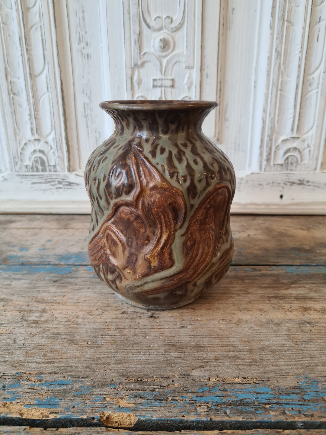Bode Willumsen unika vase fra eget værksted. Smuk glasur dekoreret med fugle i relief.