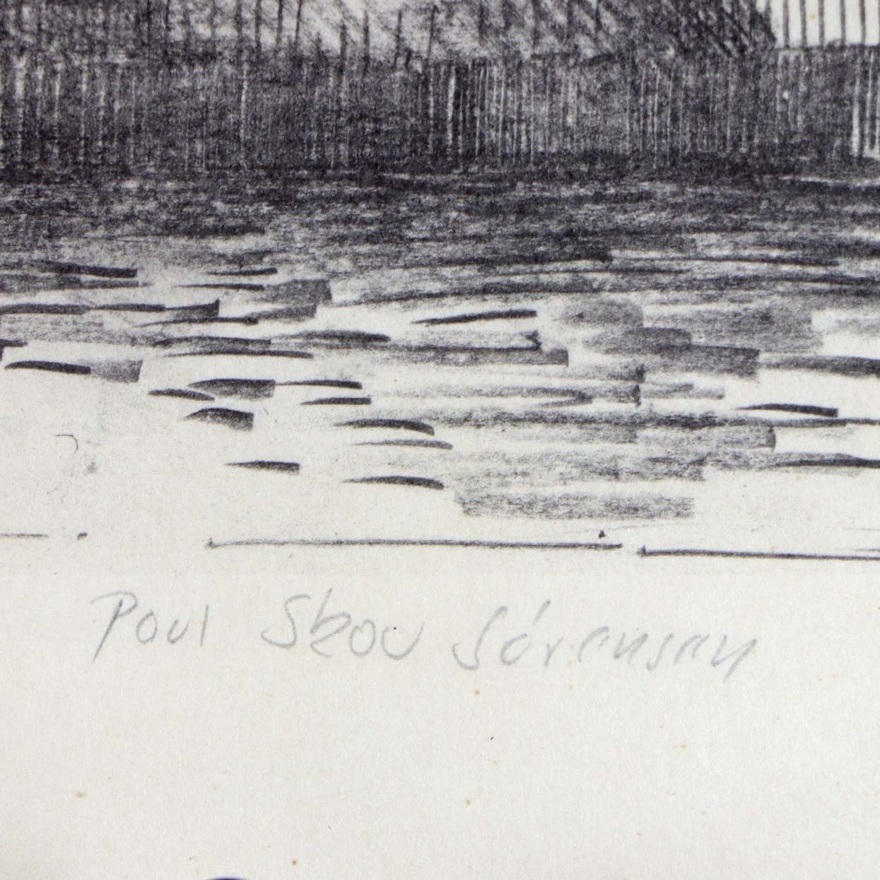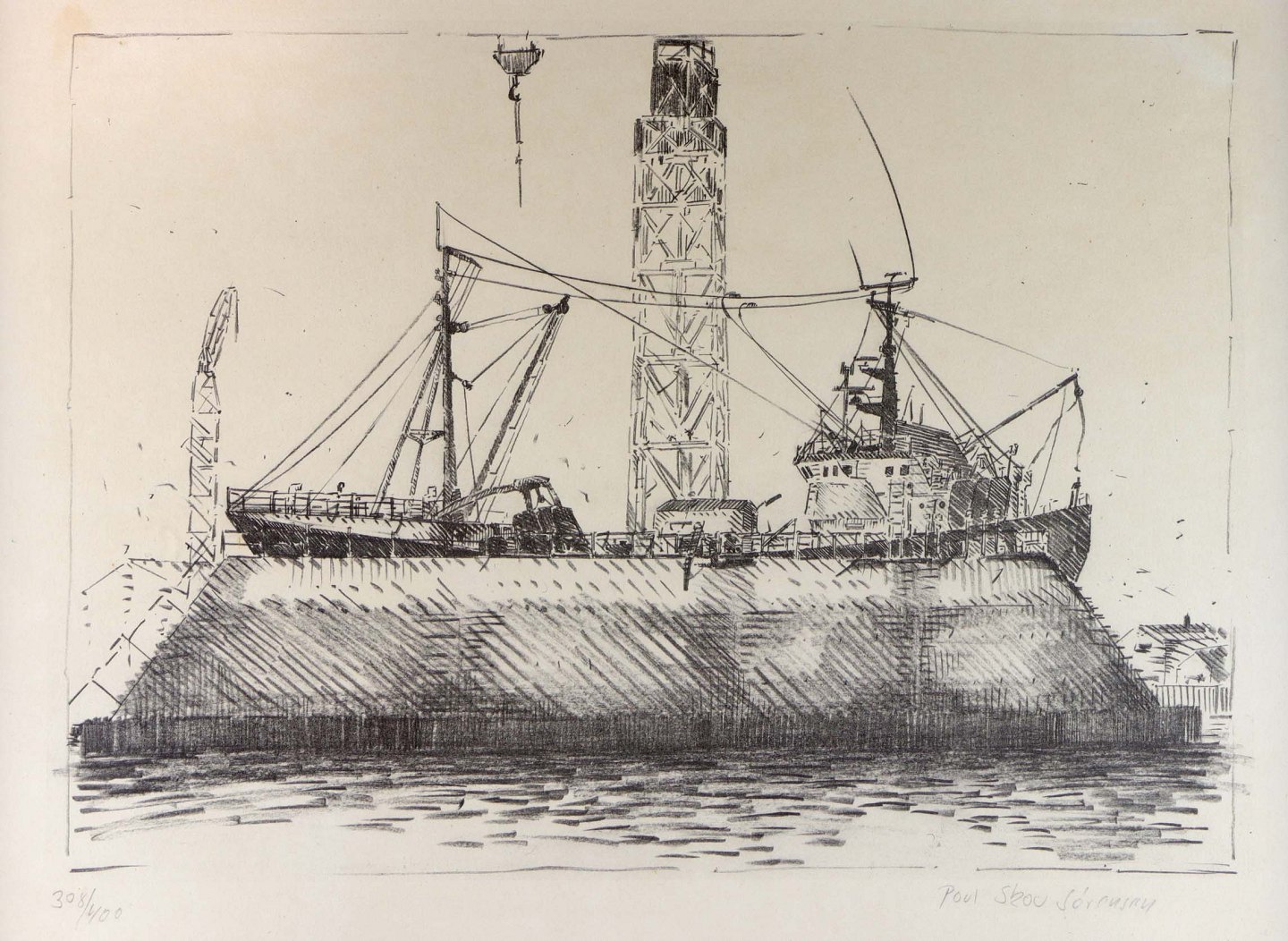 Glasindrammet litografisk tryk i sort og hvid med motiv af skib i dok. No 308/400