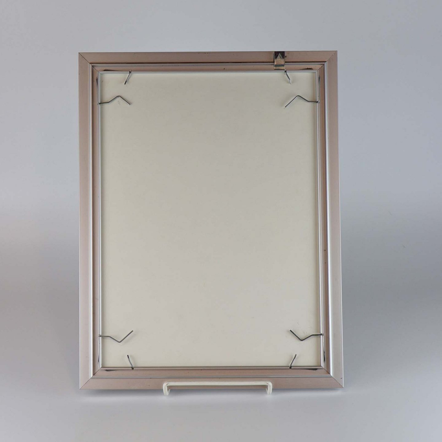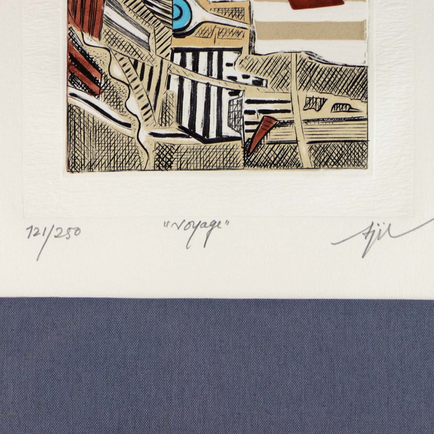 Glasindrammet abstrakt litografisk tryk på struktureret papir monteret på grå stofbaggrund. Navngivet Voyage. Nr 121/250