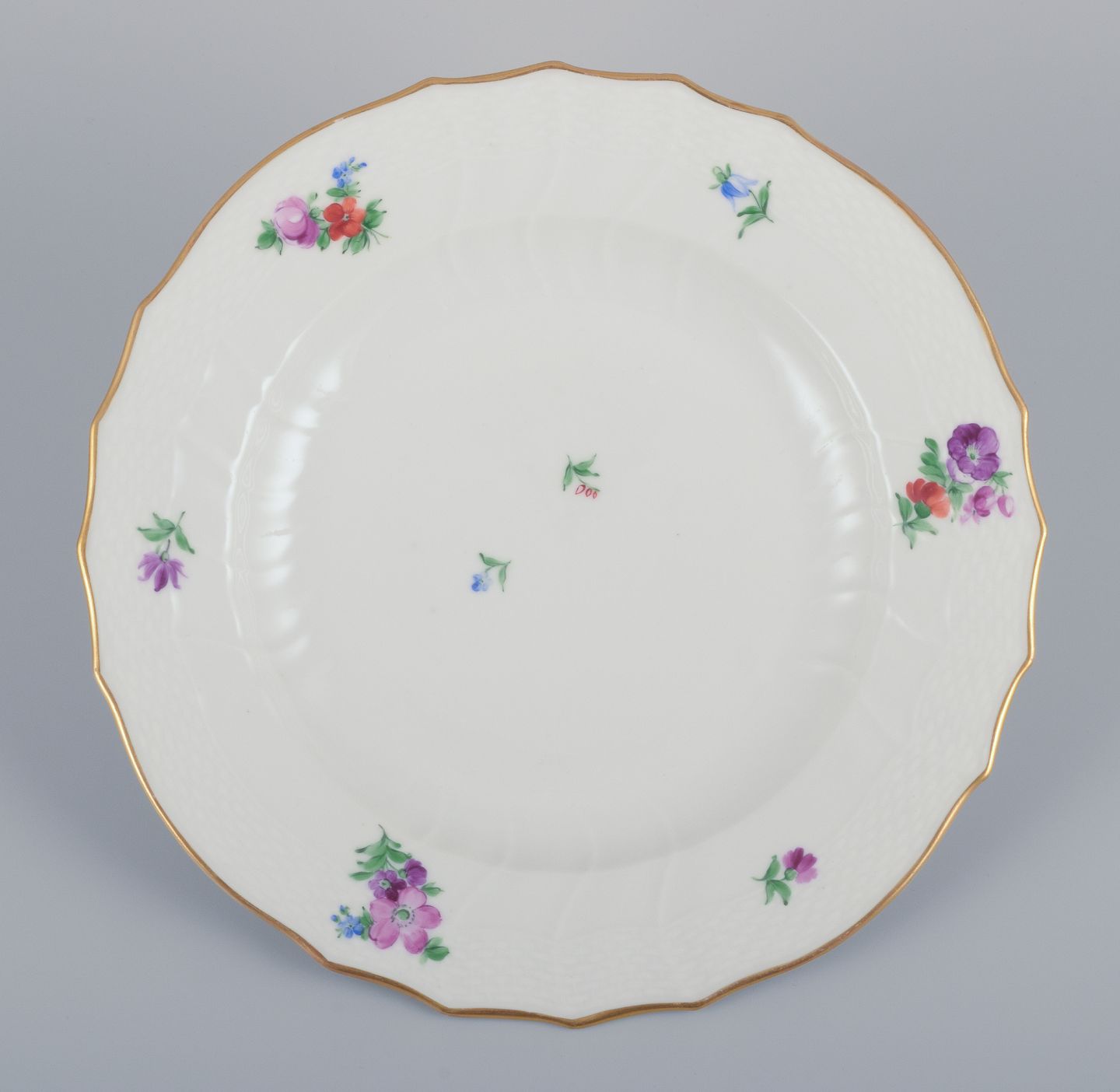 Royal Copenhagen Saksisk Blomst. Fire middagstallerkner i porcelæn. Håndmalet med polykrome blomster. Guldkant.