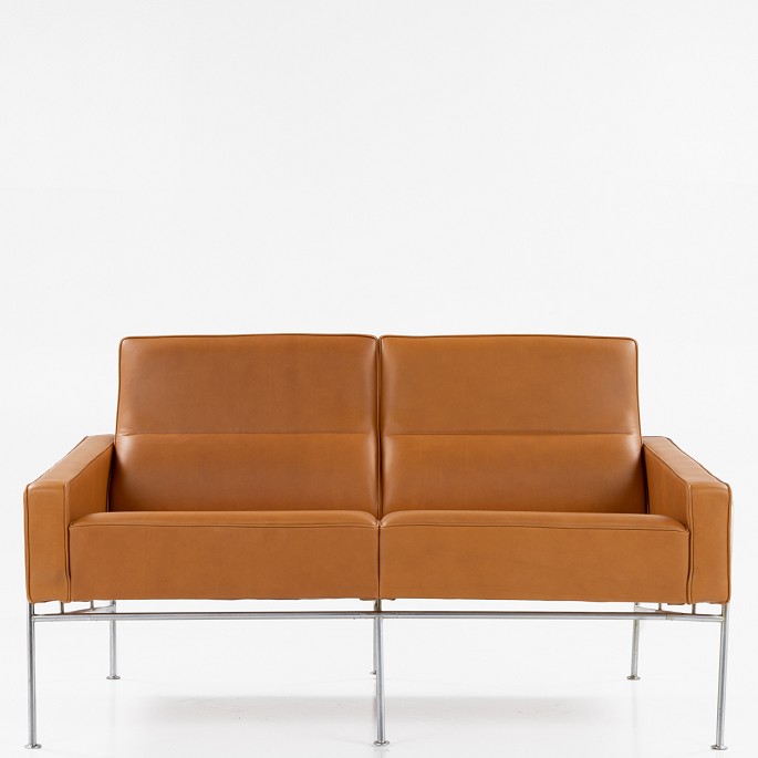 AJ 3302 - Nybetrukket 2 pers. sofa 'Lufthavnssofa' i cognacfarvet anilin-læder (Envy, Cognac fra Sørensen Læder) og stel af stål. KLASSIK tilbyder polstring af møblet med stof eller læder efter eget valg.