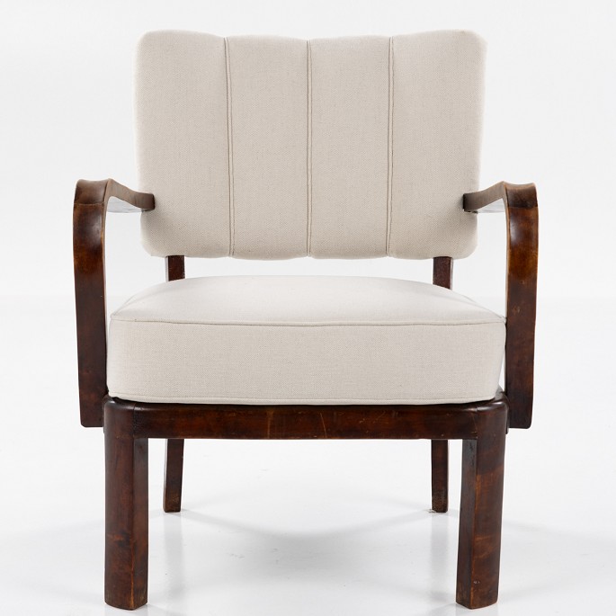 Lænestol i bejdset birketræ med ryg og sæde i lyst uldbetræk.