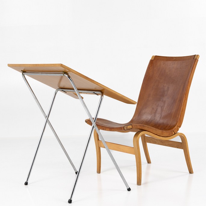 Lænestol (model Eva) i patineret bøg og kernelæder m. læseklap. Mærket fra producent.