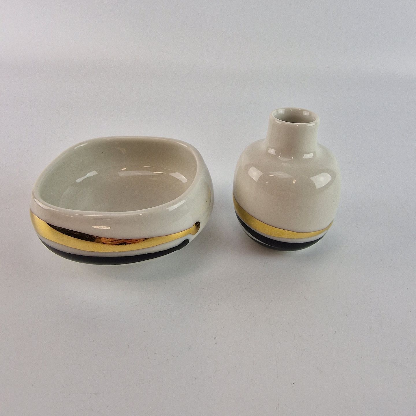 Vase og skål af porcelæn glaseret hvidt og dekoreret med en sort og en guld stribe. Nr 80/5379 og Nr 50/5329