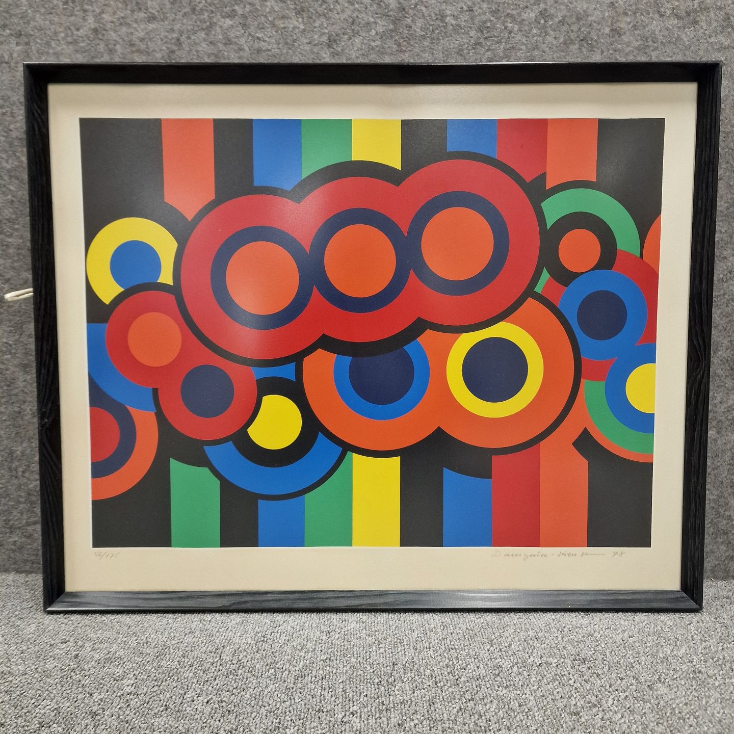 Litografi med grafiske mønstre i stærke farver. Dateret 1978. Nr. 56/175