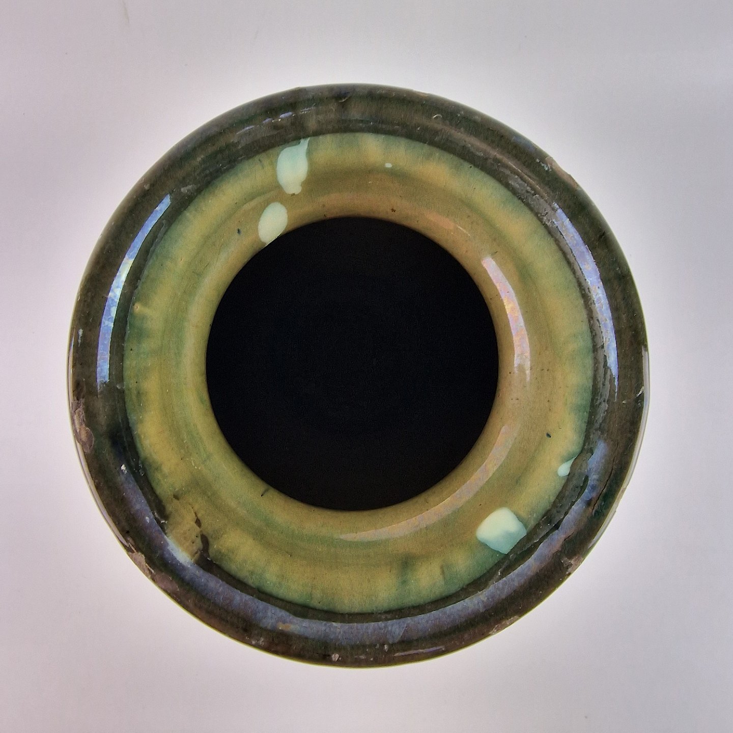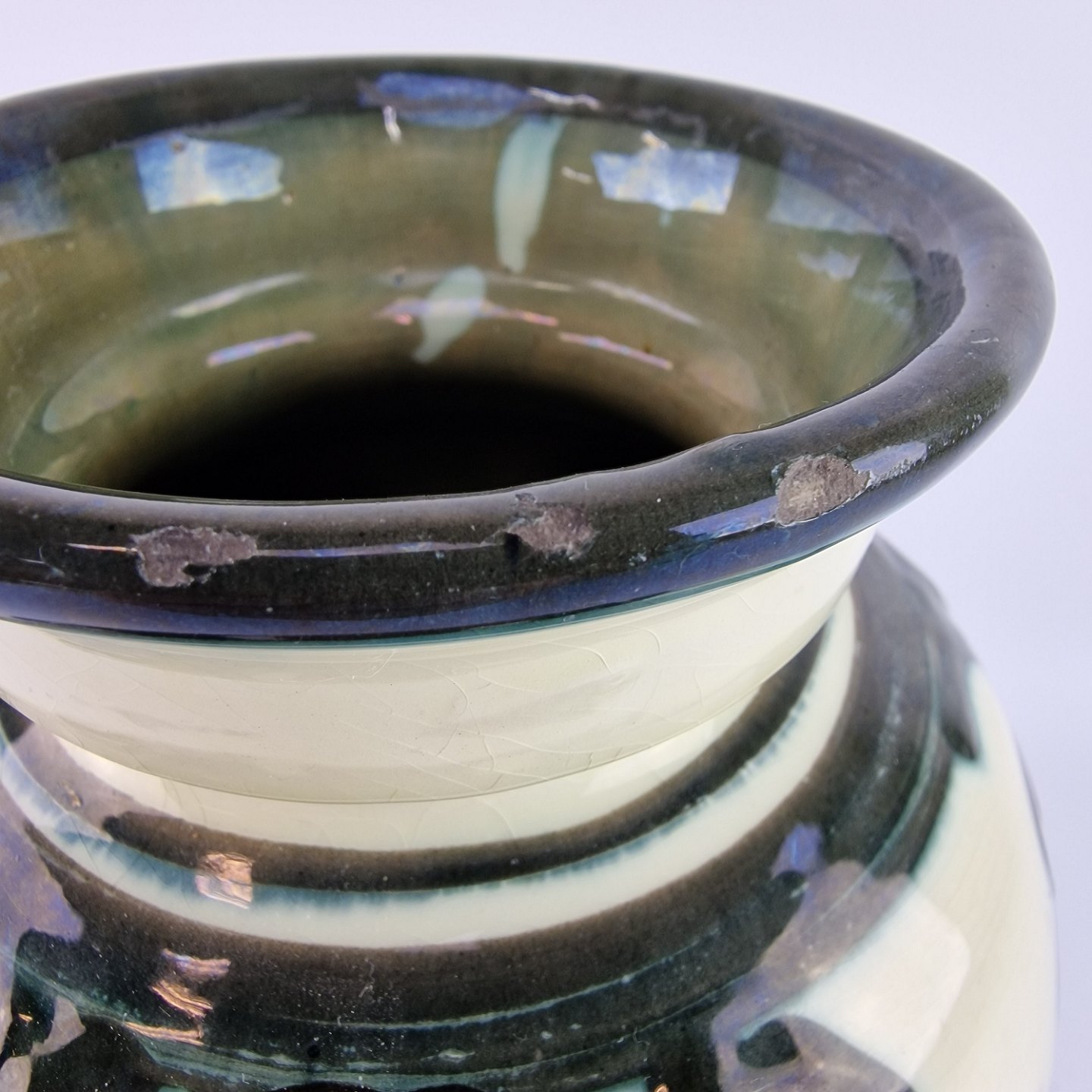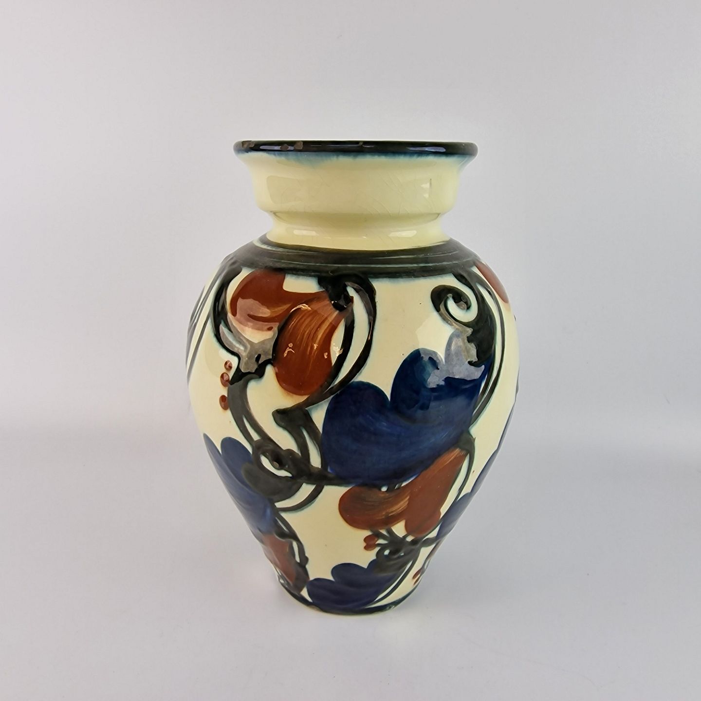 Vase med mørk glasering indeni og mønster med blå og rødbrune blomster udenpå
