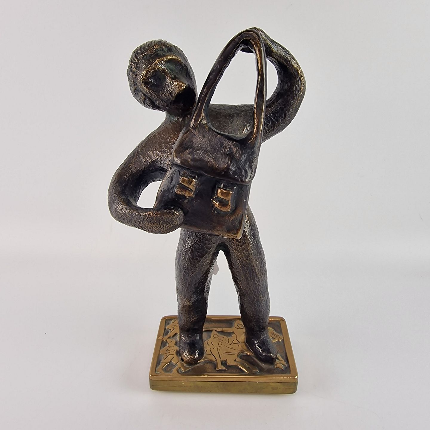 Skulptur af en mand med en taske foran sig. Figuren er af bronze.