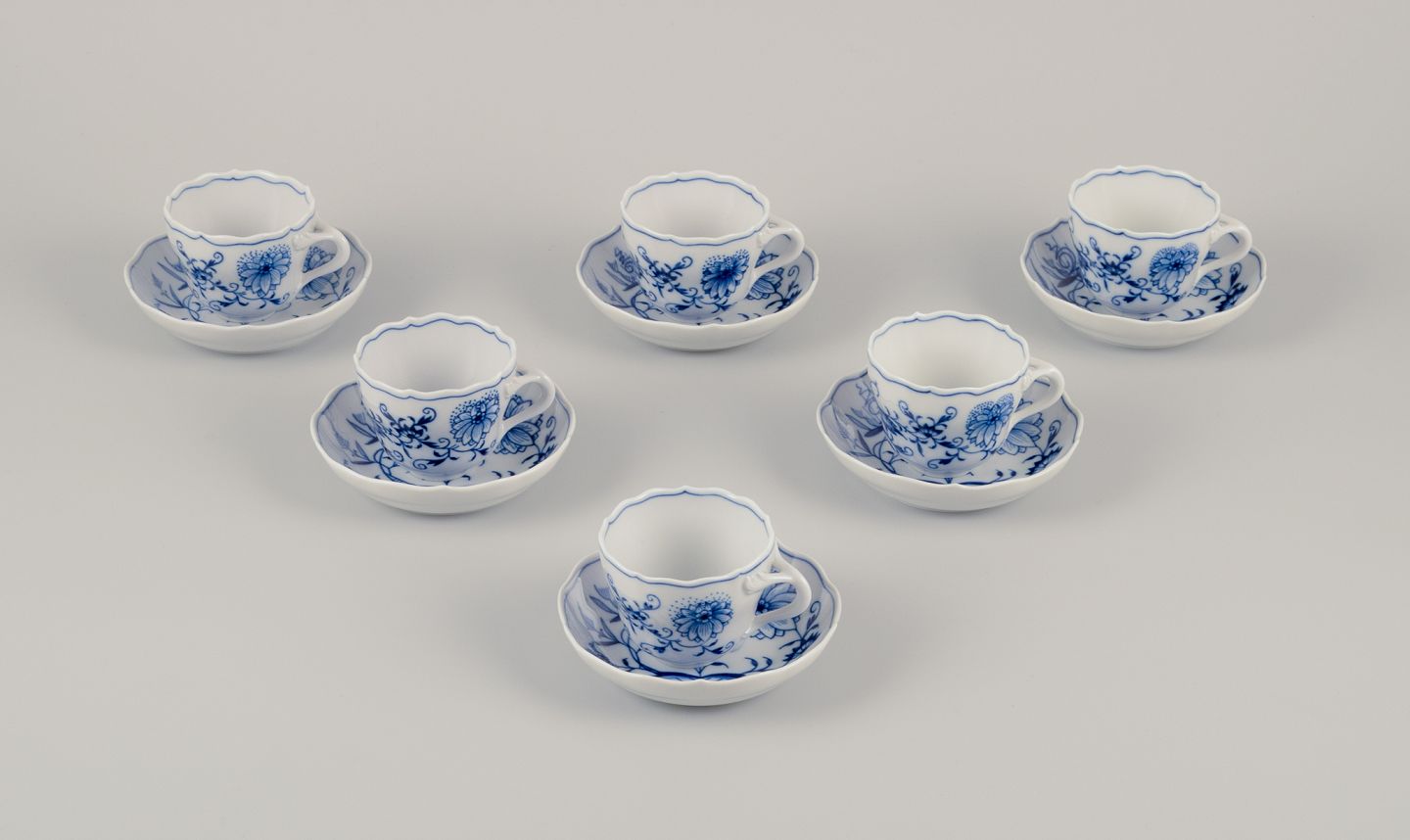 Et sæt på seks Løgmønstret mokkakopper med tilhørende underkopper.